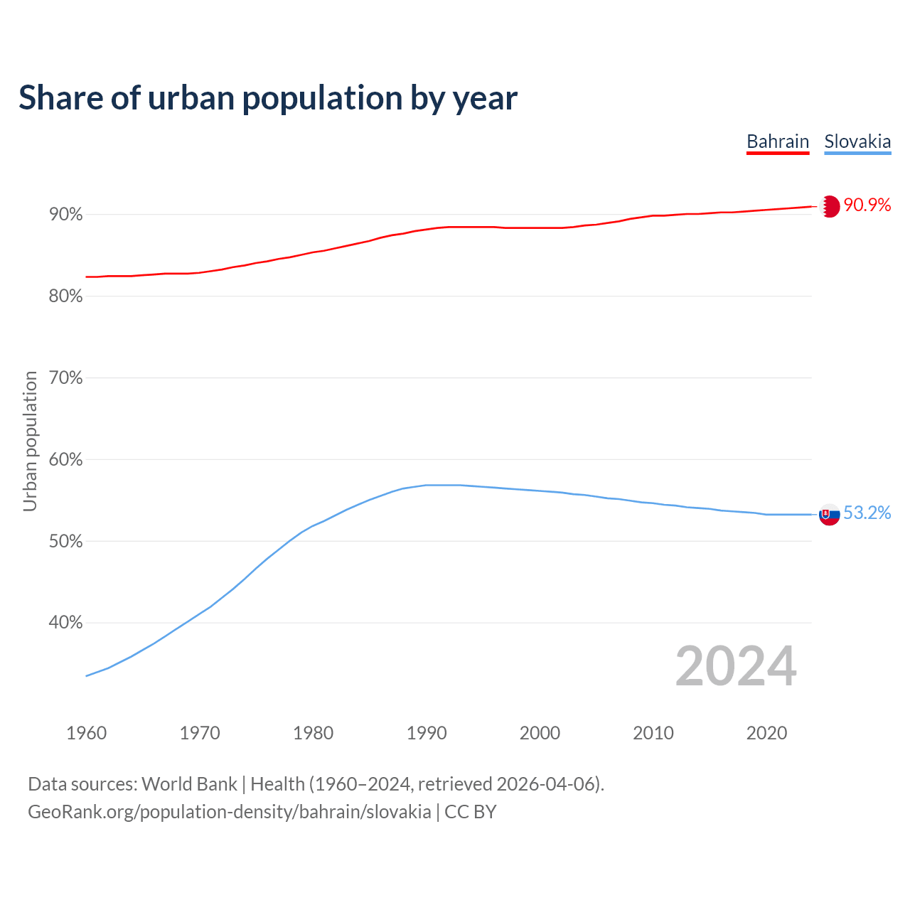 From 2004 to 2024, the share of urban population changed from 88.6% to 90.9% in Bahrain and from 55.6% to 53.2% in Slovakia.