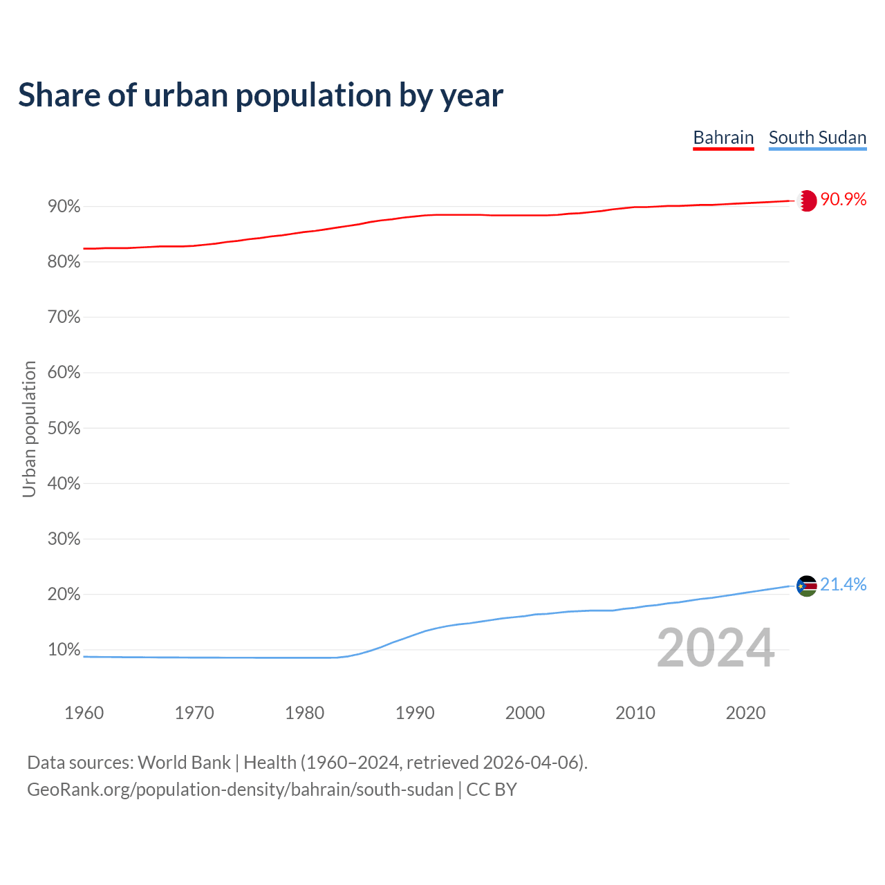 From 2004 to 2024, the share of urban population changed from 88.6% to 90.9% in Bahrain and from 16.8% to 21.4% in South Sudan.