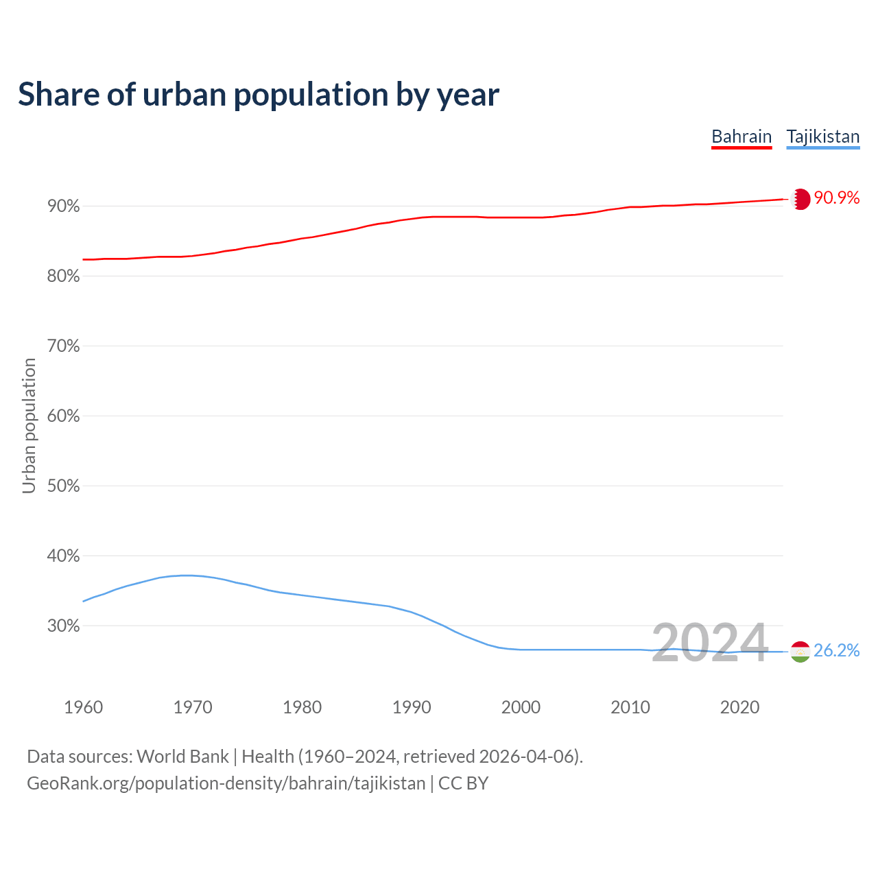 From 2004 to 2024, the share of urban population changed from 88.6% to 90.9% in Bahrain and from 26.5% to 26.2% in Tajikistan.