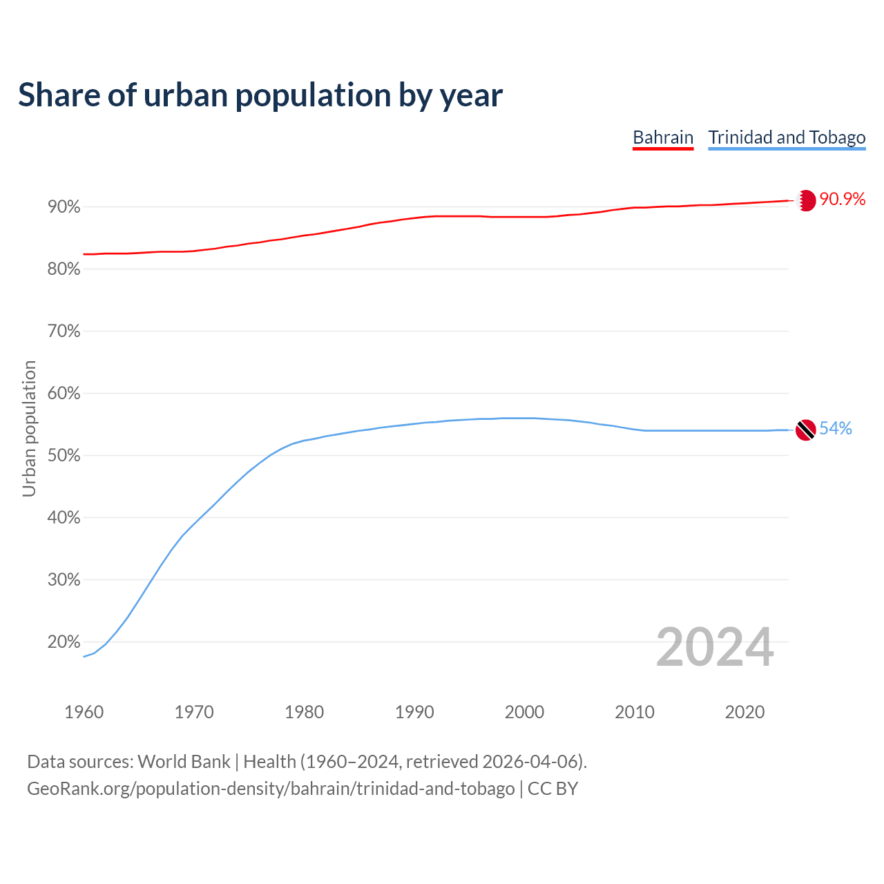 From 2004 to 2024, the share of urban population changed from 88.6% to 90.9% in Bahrain and from 55.6% to 54% in Trinidad and Tobago.