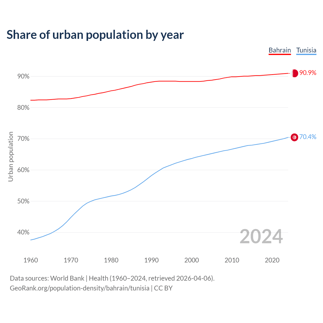 From 2004 to 2024, the share of urban population changed from 88.6% to 90.9% in Bahrain and from 64.9% to 70.4% in Tunisia.