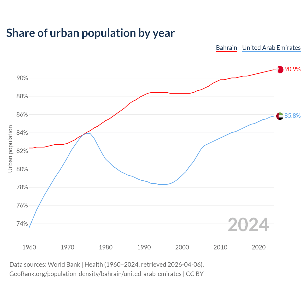 From 2004 to 2024, the share of urban population changed from 88.6% to 90.9% in Bahrain and from 81.5% to 85.8% in the United Arab Emirates.