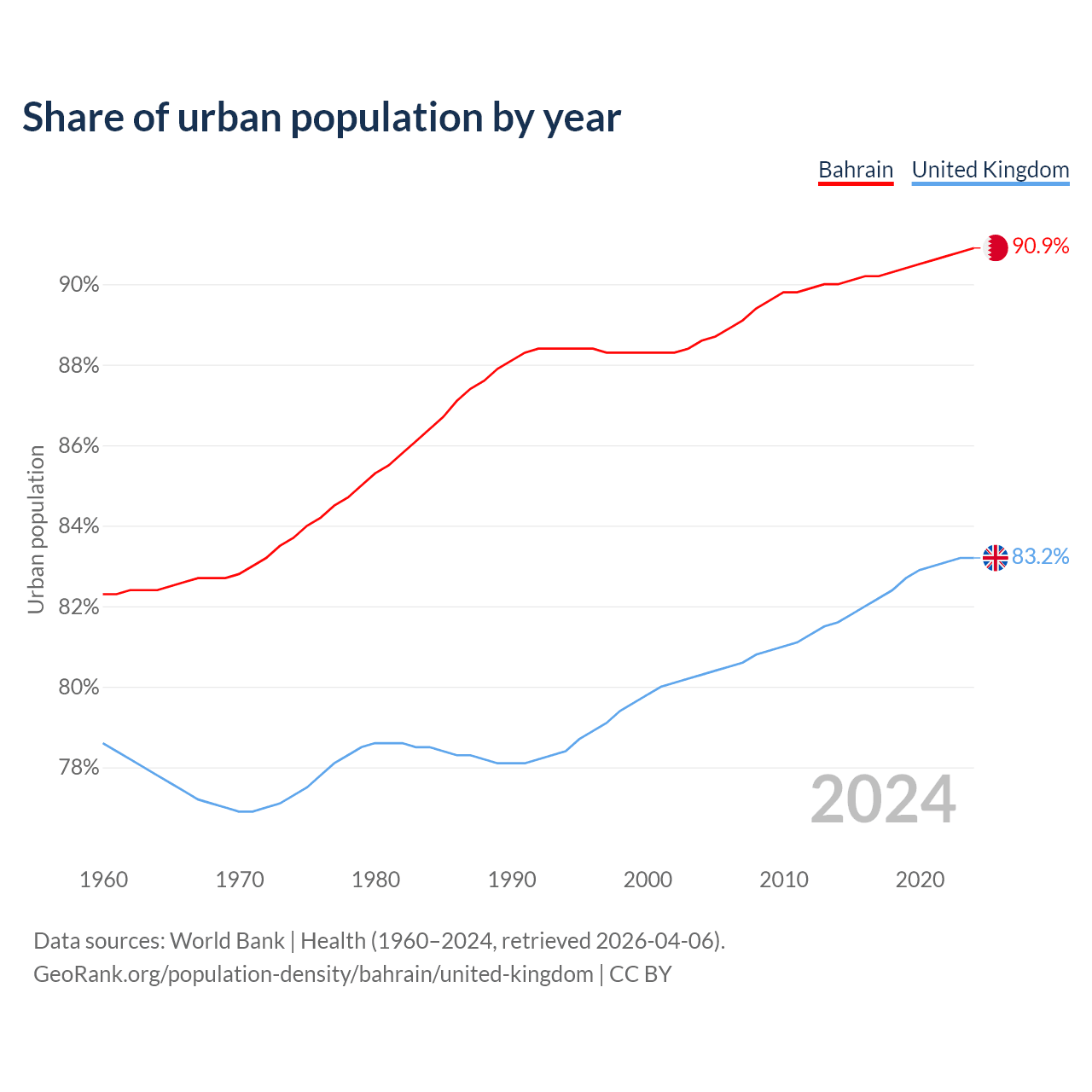 From 2004 to 2024, the share of urban population changed from 88.6% to 90.9% in Bahrain and from 80.3% to 83.2% in the United Kingdom.