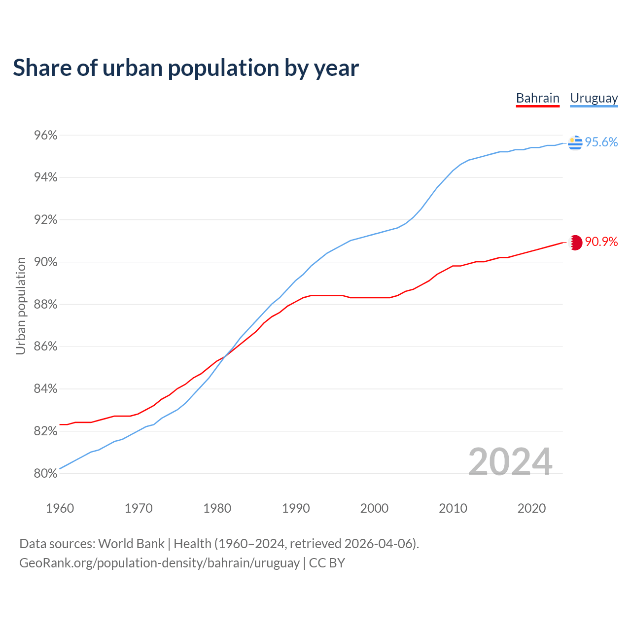 From 2004 to 2024, the share of urban population changed from 88.6% to 90.9% in Bahrain and from 91.8% to 95.6% in Uruguay.