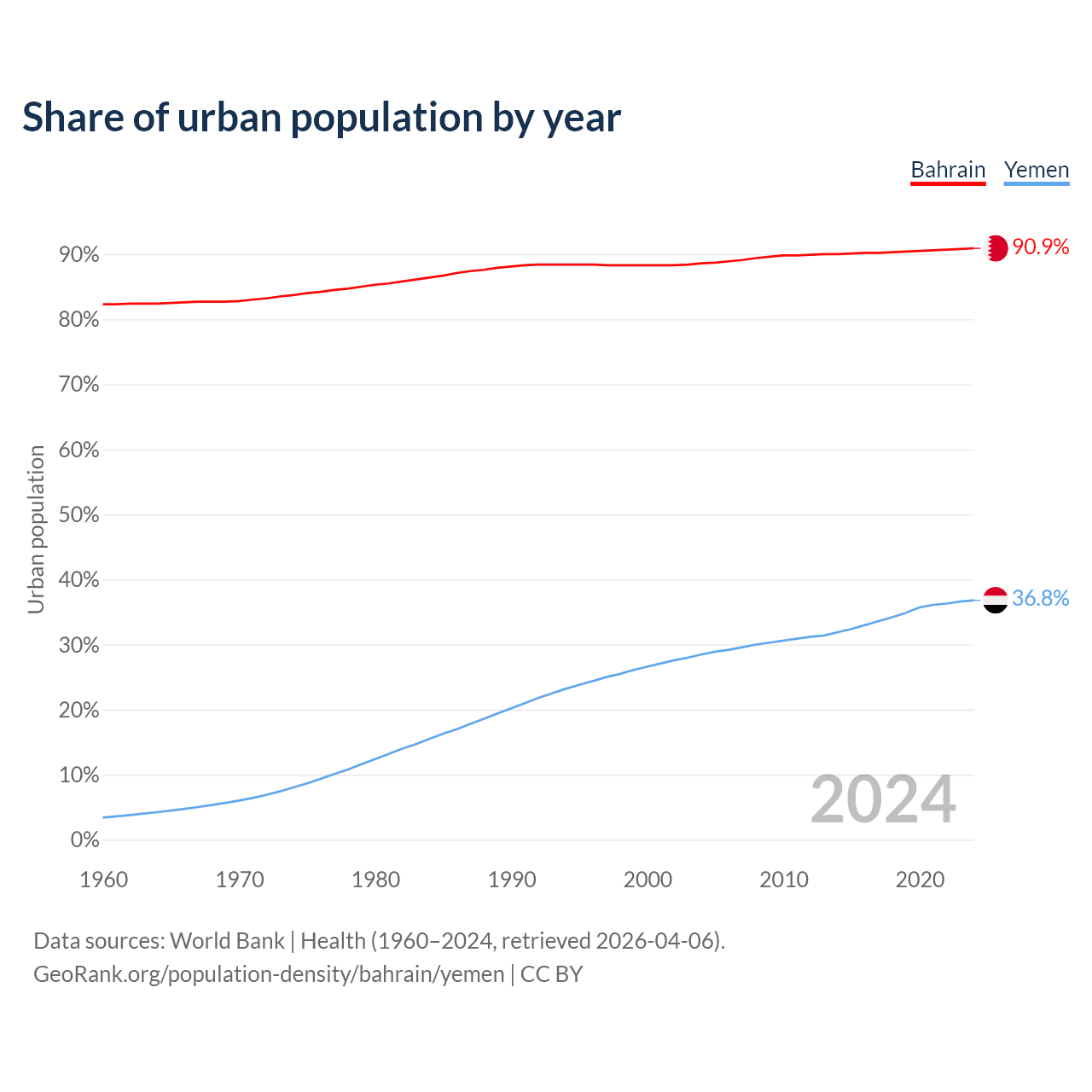 From 2004 to 2024, the share of urban population changed from 88.6% to 90.9% in Bahrain and from 28.5% to 36.8% in Yemen.