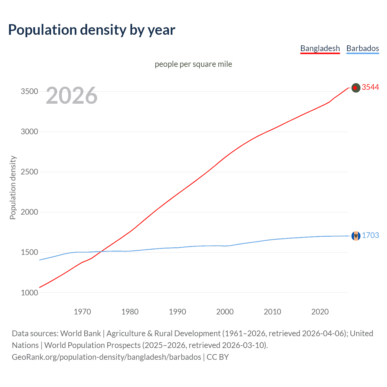 From 2006 to 2026, population density in Bangladesh increased by 21.6%, compared to a 4.73% growth in Barbados.