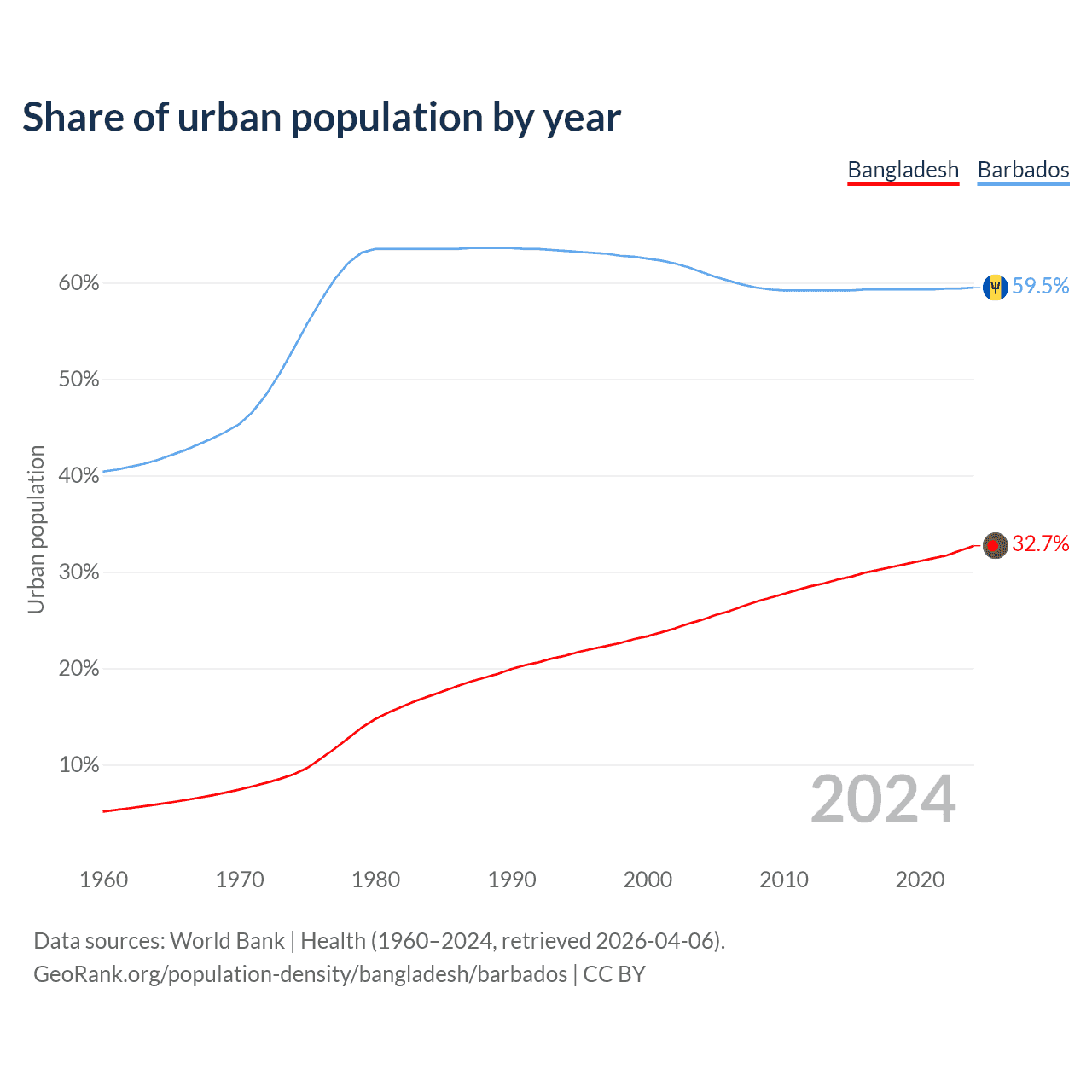 From 2004 to 2024, the share of urban population changed from 25% to 32.7% in Bangladesh and from 61.1% to 59.5% in Barbados.