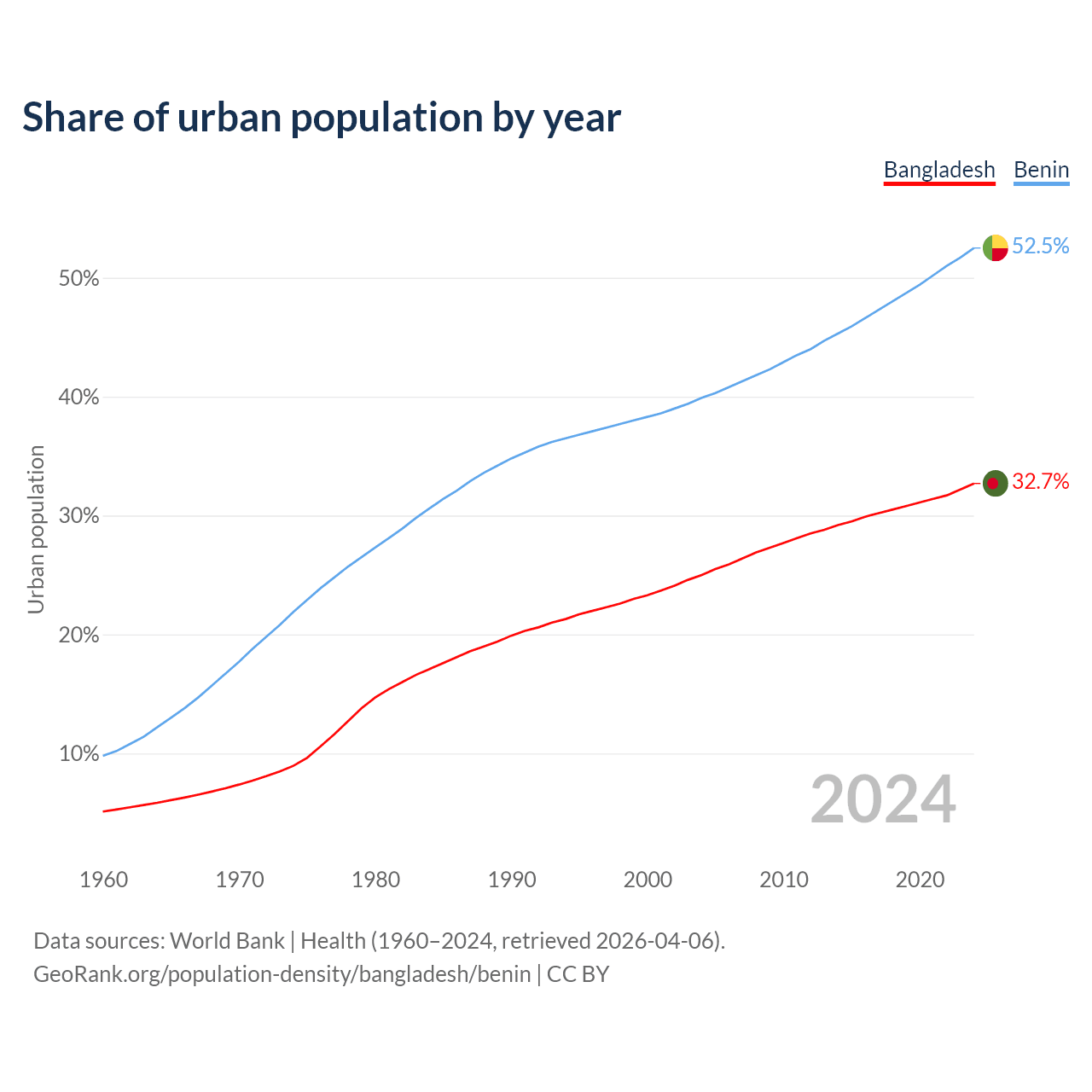 From 2004 to 2024, the share of urban population changed from 25% to 32.7% in Bangladesh and from 39.9% to 52.5% in Benin.