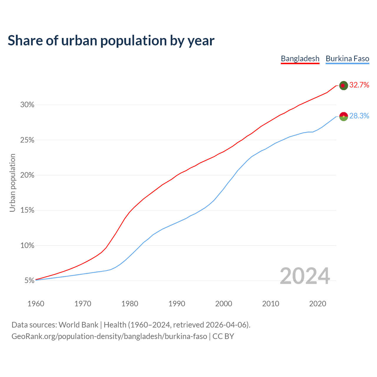 From 2004 to 2024, the share of urban population changed from 25% to 32.7% in Bangladesh and from 21.3% to 28.3% in Burkina Faso.