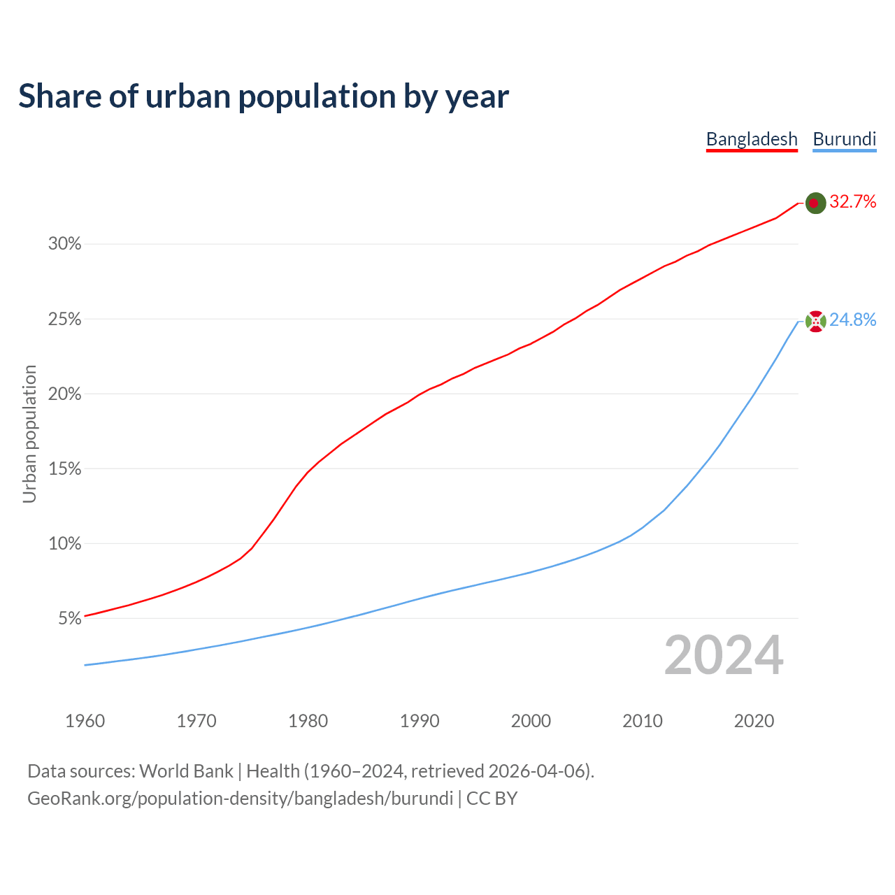 From 2004 to 2024, the share of urban population changed from 25% to 32.7% in Bangladesh and from 8.92% to 24.8% in Burundi.
