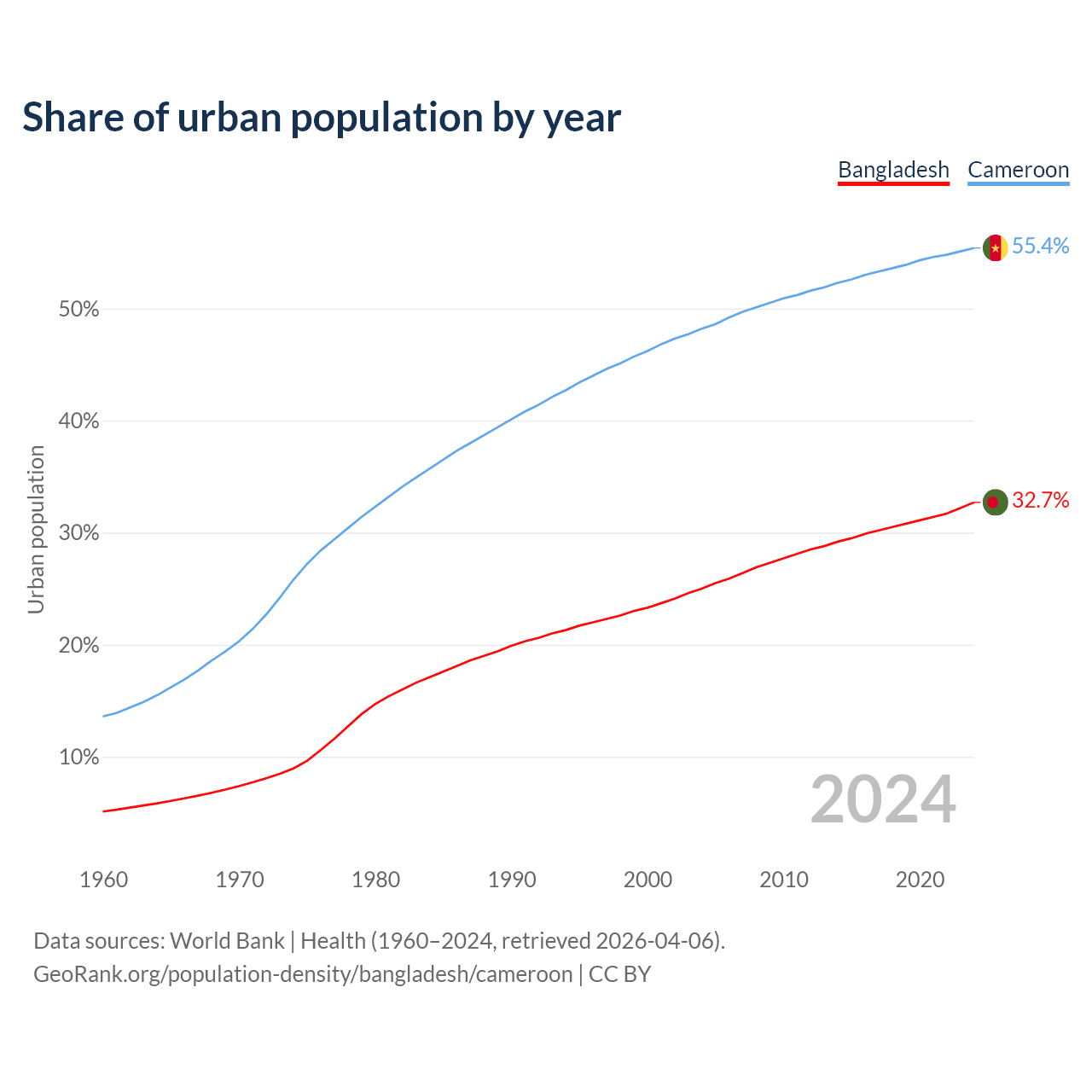 From 2004 to 2024, the share of urban population changed from 25% to 32.7% in Bangladesh and from 48.2% to 55.4% in Cameroon.