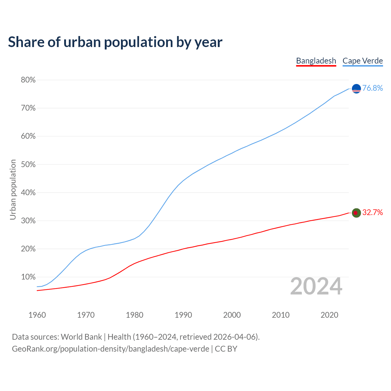 From 2004 to 2024, the share of urban population changed from 25% to 32.7% in Bangladesh and from 57.1% to 76.8% in Cape Verde.