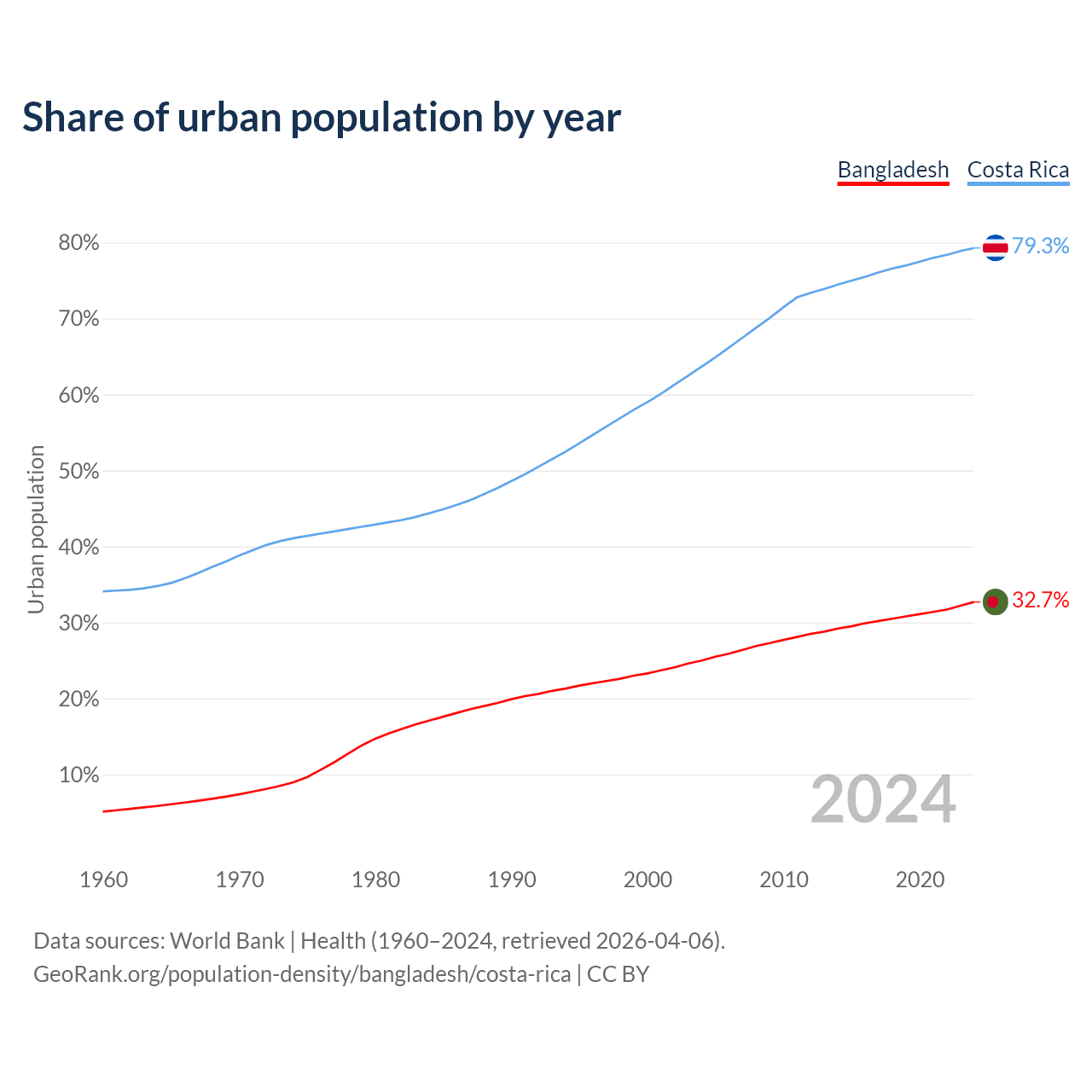 From 2004 to 2024, the share of urban population changed from 25% to 32.7% in Bangladesh and from 63.7% to 79.3% in Costa Rica.