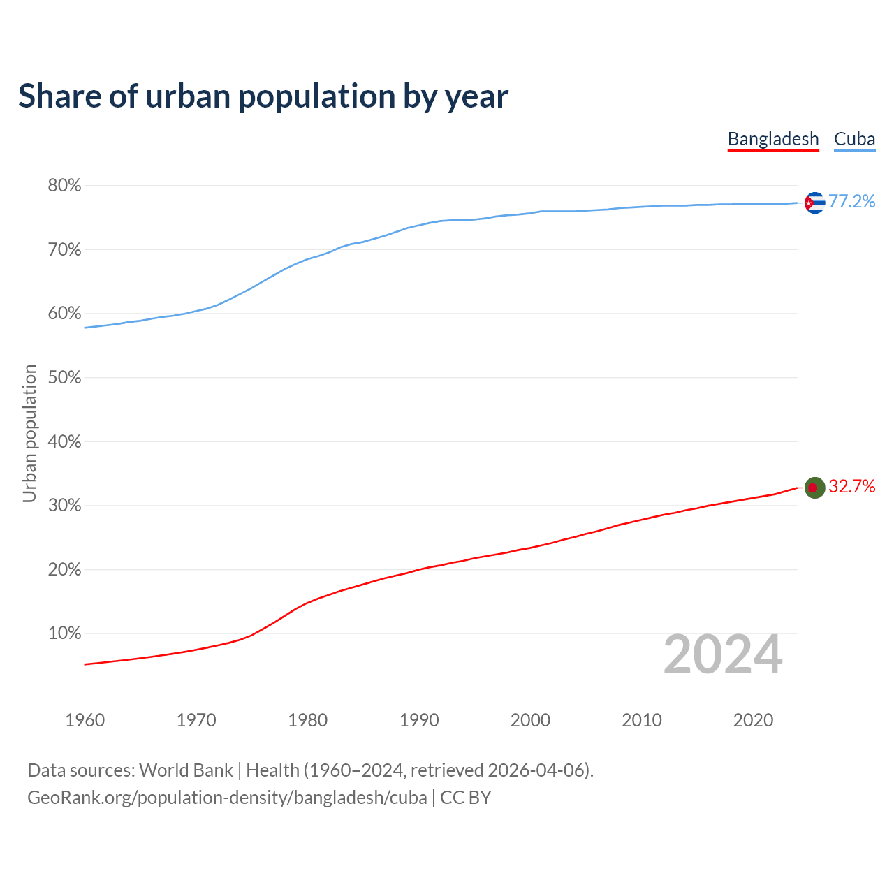From 2004 to 2024, the share of urban population changed from 25% to 32.7% in Bangladesh and from 75.9% to 77.2% in Cuba.