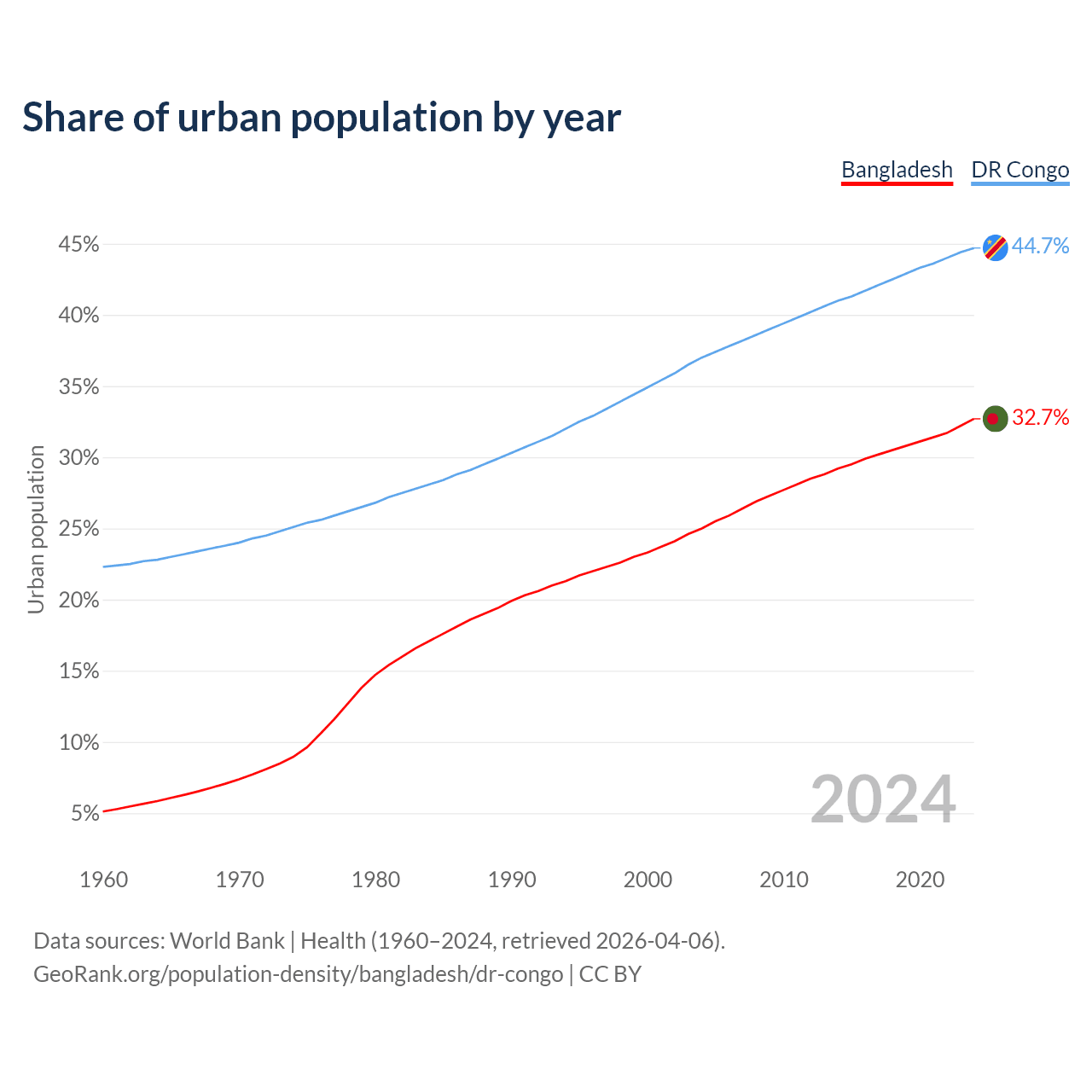 From 2004 to 2024, the share of urban population changed from 25% to 32.7% in Bangladesh and from 37% to 44.7% in the DR Congo.
