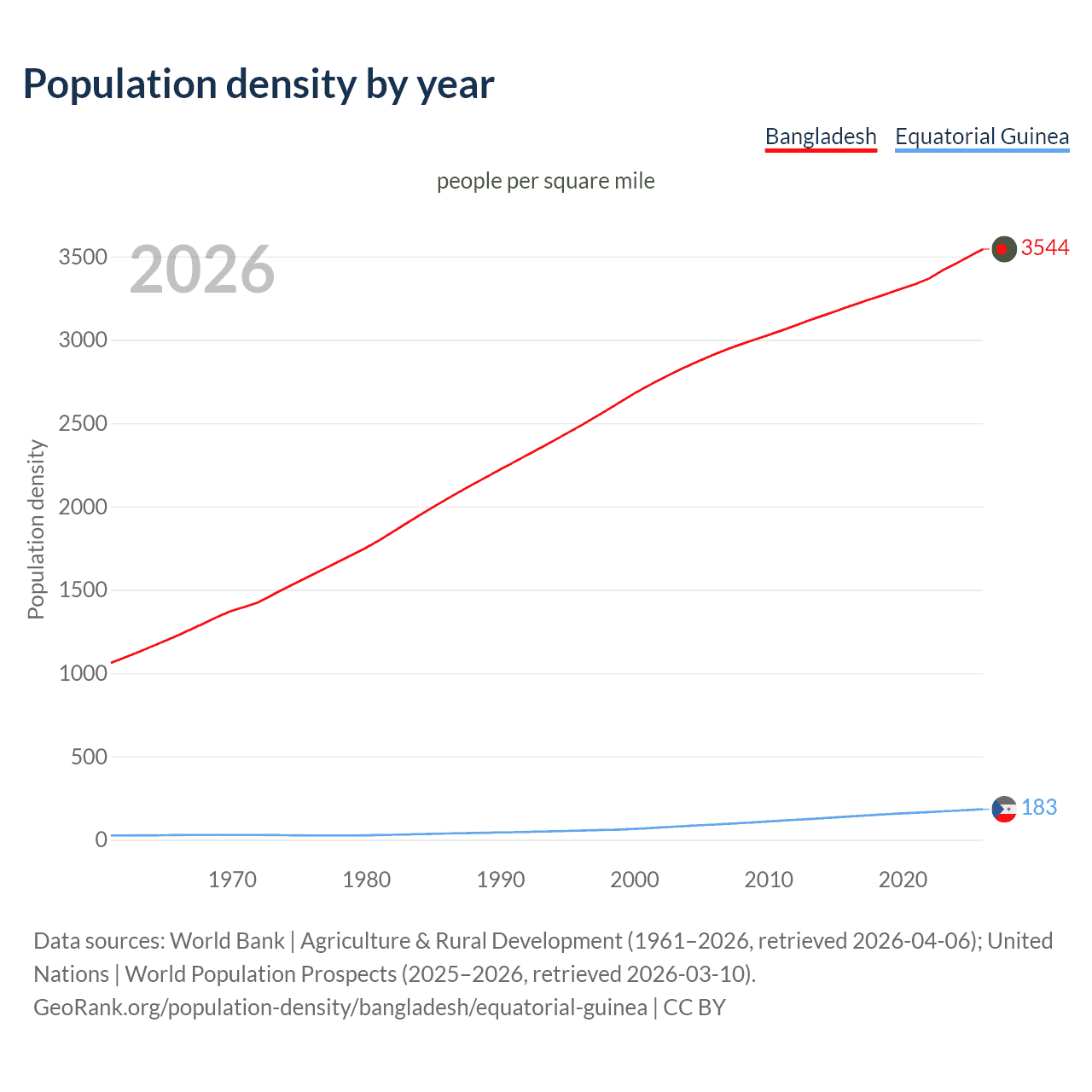 From 2006 to 2026, population density in Bangladesh increased by 21.6%, compared to a 100.5% growth in Equatorial Guinea.