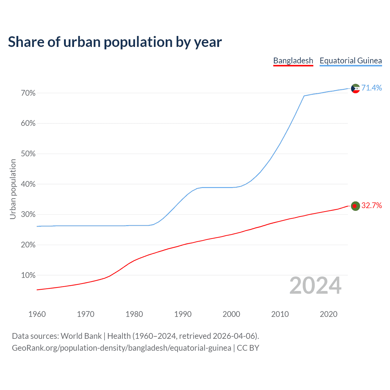 From 2004 to 2024, the share of urban population changed from 25% to 32.7% in Bangladesh and from 40.9% to 71.4% in Equatorial Guinea.