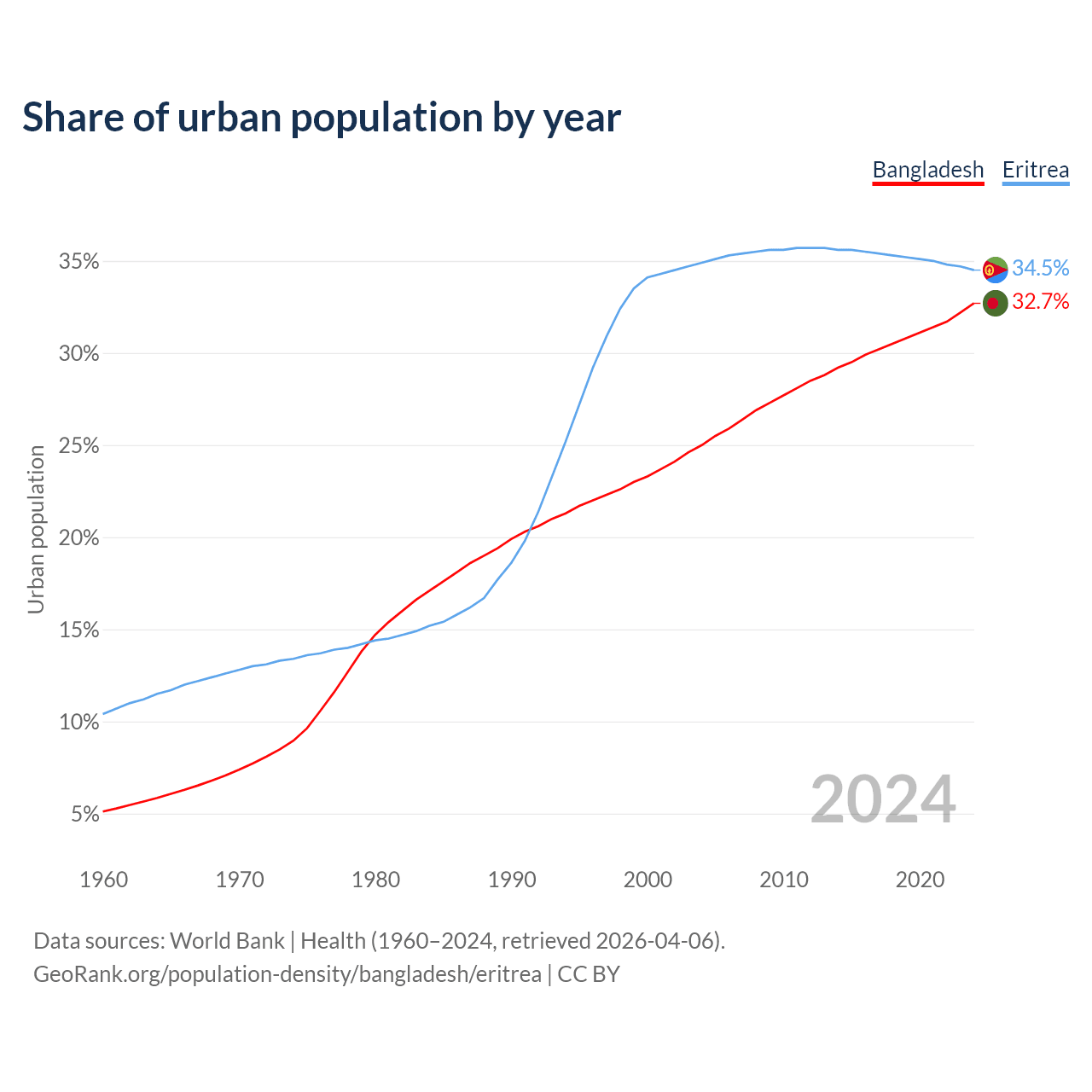 From 2004 to 2024, the share of urban population changed from 25% to 32.7% in Bangladesh and from 34.9% to 34.5% in Eritrea.