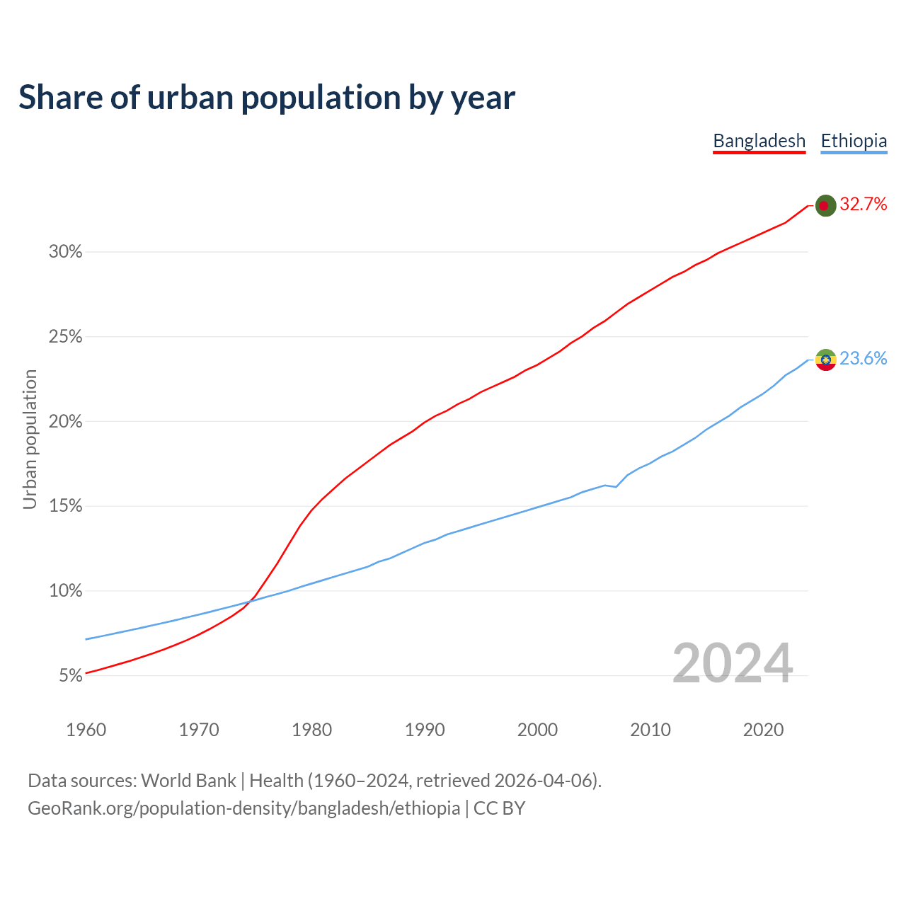 From 2004 to 2024, the share of urban population changed from 25% to 32.7% in Bangladesh and from 15.8% to 23.6% in Ethiopia.