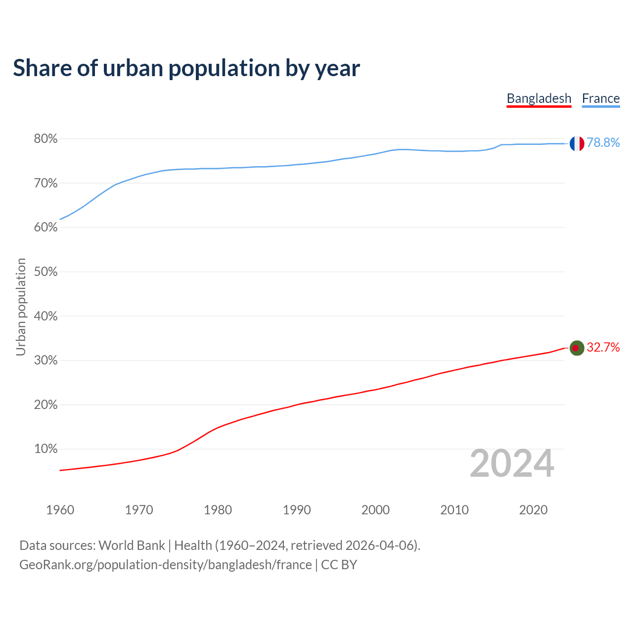 From 2004 to 2024, the share of urban population changed from 25% to 32.7% in Bangladesh and from 77.5% to 78.8% in France.
