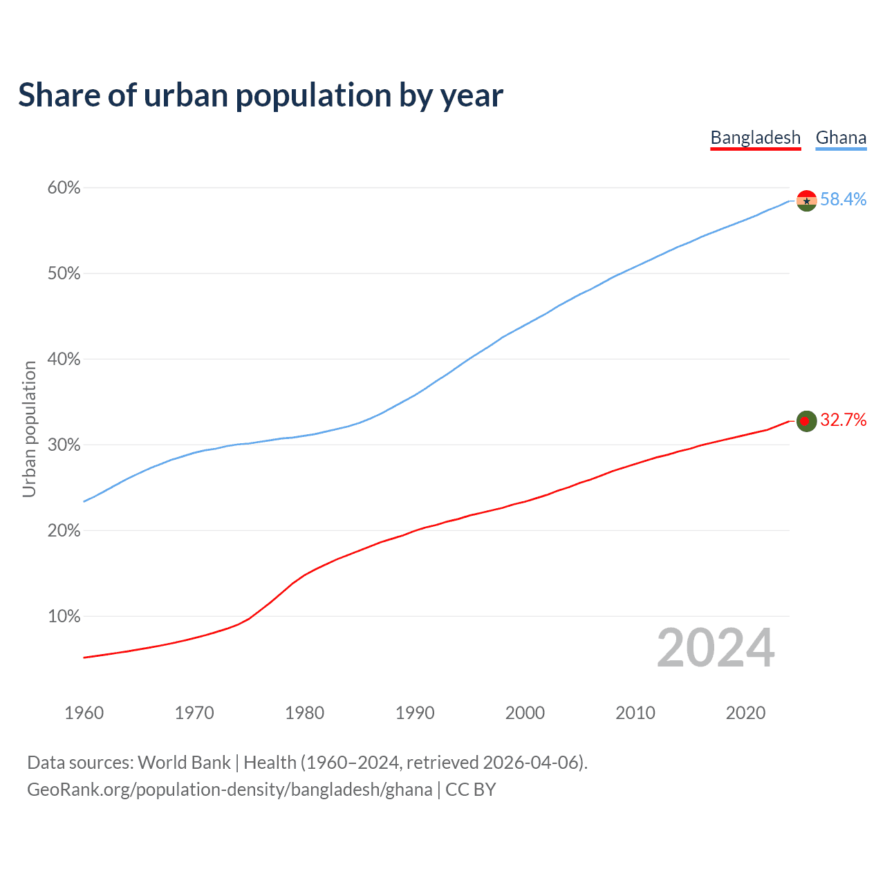 From 2004 to 2024, the share of urban population changed from 25% to 32.7% in Bangladesh and from 46.8% to 58.4% in Ghana.