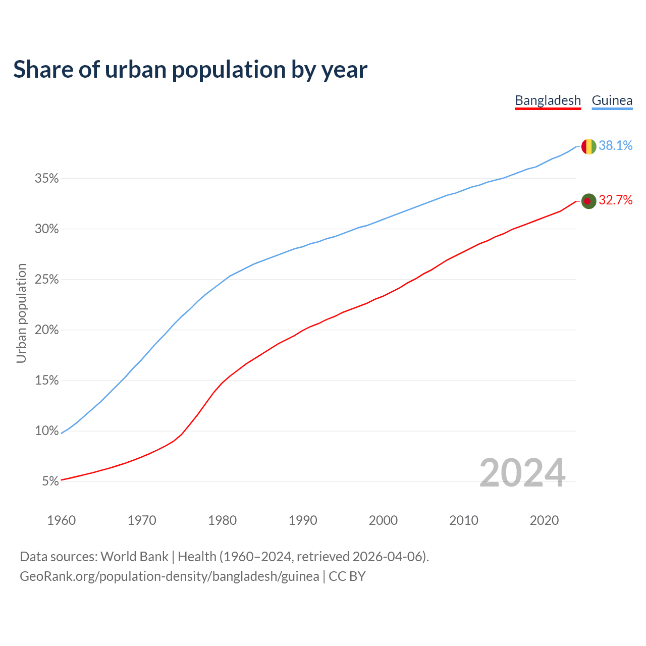 From 2004 to 2024, the share of urban population changed from 25% to 32.7% in Bangladesh and from 32.1% to 38.1% in Guinea.