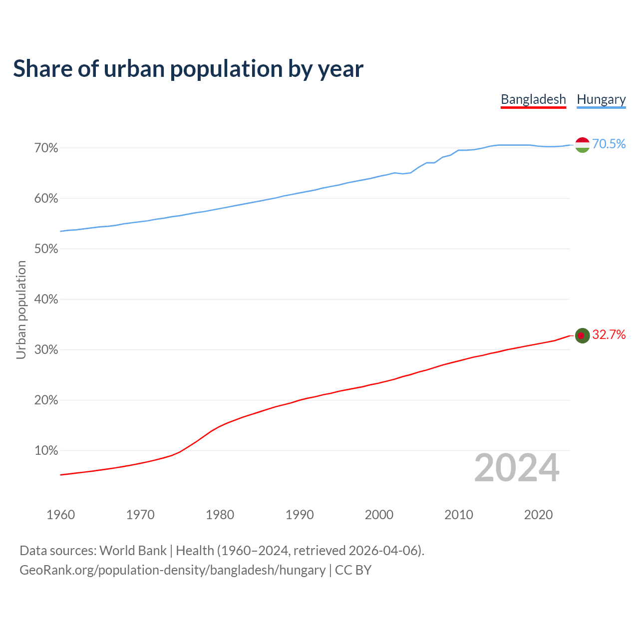 From 2004 to 2024, the share of urban population changed from 25% to 32.7% in Bangladesh and from 65% to 70.5% in Hungary.