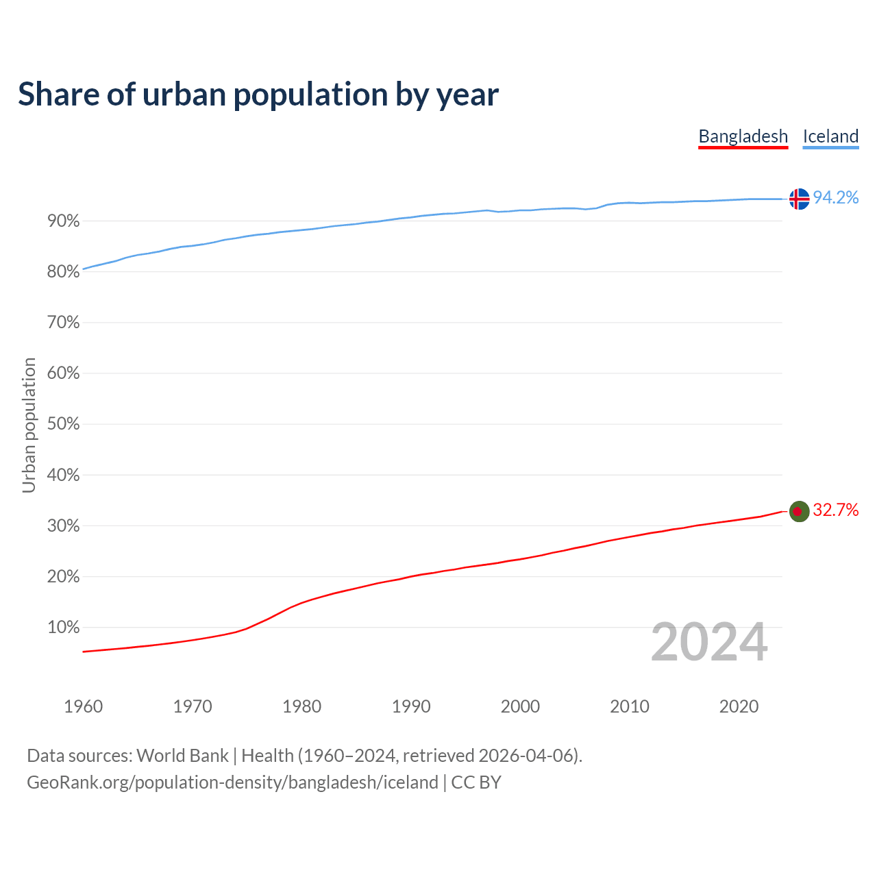 From 2004 to 2024, the share of urban population changed from 25% to 32.7% in Bangladesh and from 92.4% to 94.2% in Iceland.