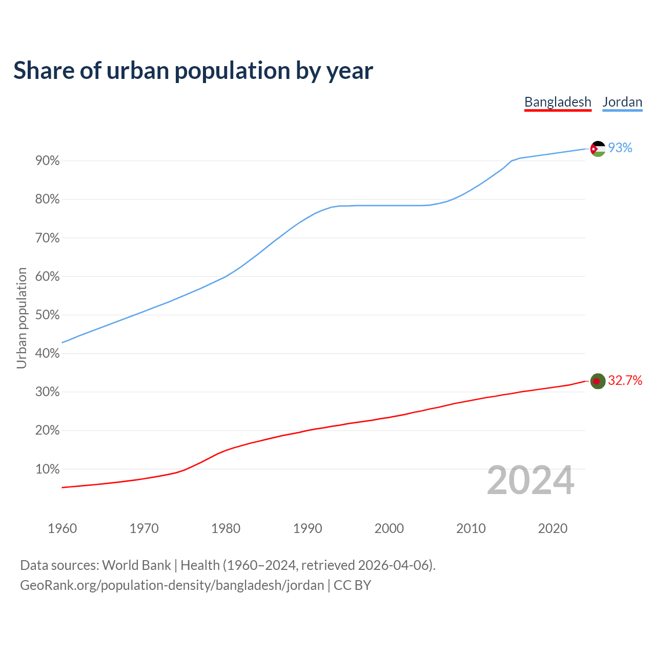 From 2004 to 2024, the share of urban population changed from 25% to 32.7% in Bangladesh and from 78.3% to 93% in Jordan.