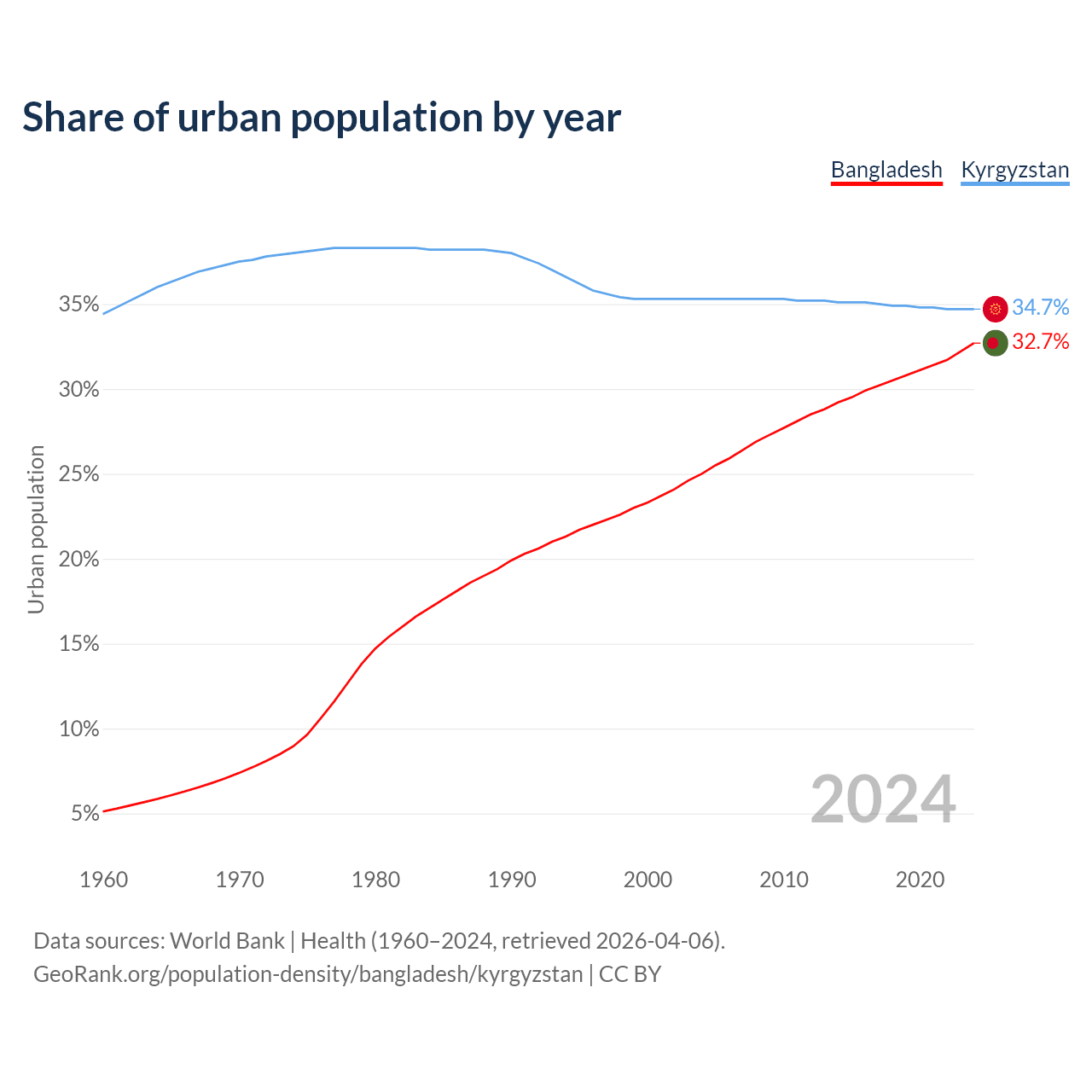 From 2004 to 2024, the share of urban population changed from 25% to 32.7% in Bangladesh and from 35.3% to 34.7% in Kyrgyzstan.