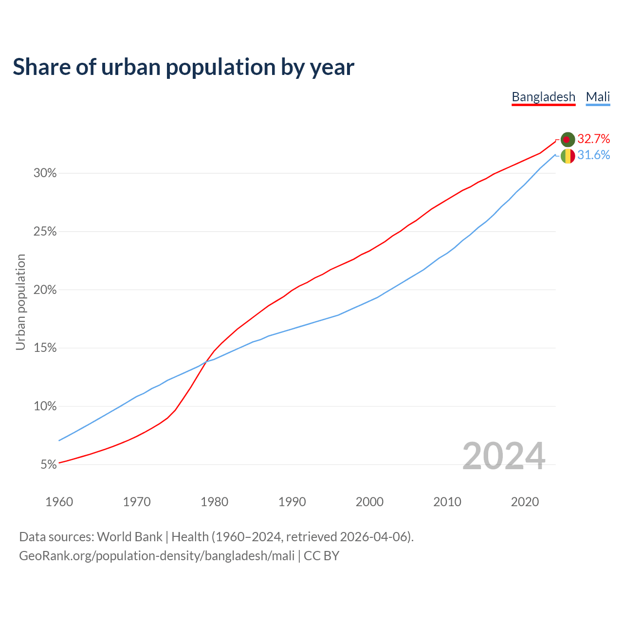 From 2004 to 2024, the share of urban population changed from 25% to 32.7% in Bangladesh and from 20.5% to 31.6% in Mali.