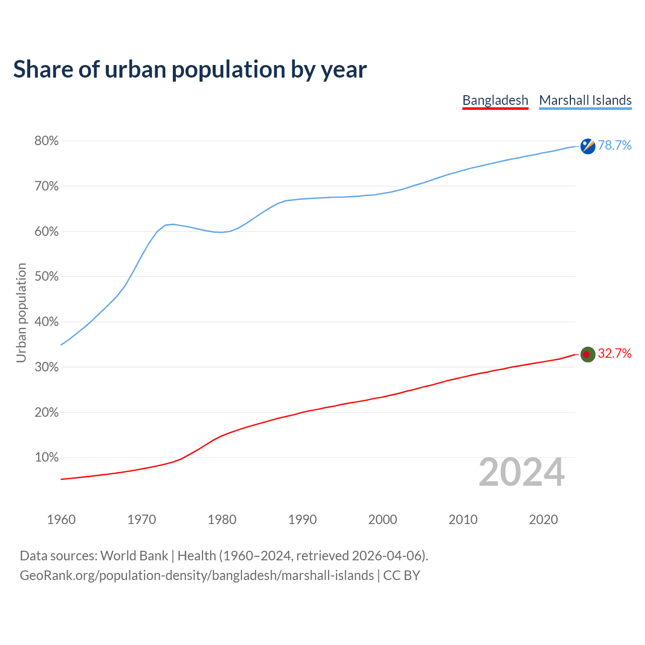 From 2004 to 2024, the share of urban population changed from 25% to 32.7% in Bangladesh and from 70.1% to 78.7% in the Marshall Islands.