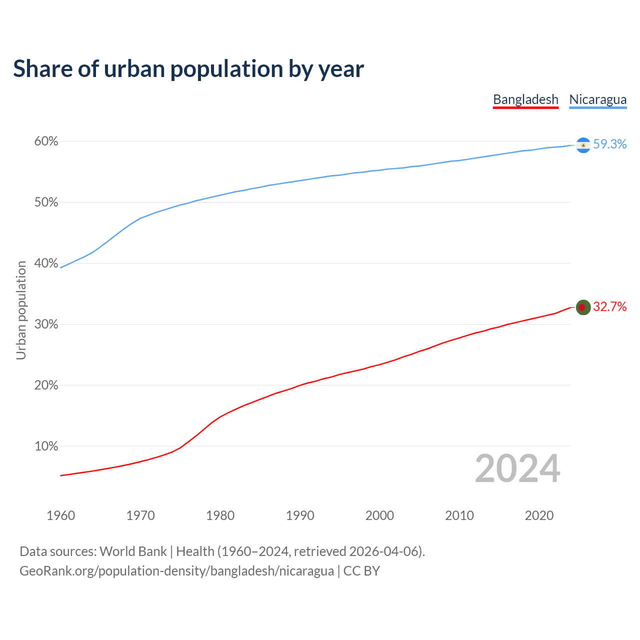 From 2004 to 2024, the share of urban population changed from 25% to 32.7% in Bangladesh and from 55.8% to 59.3% in Nicaragua.