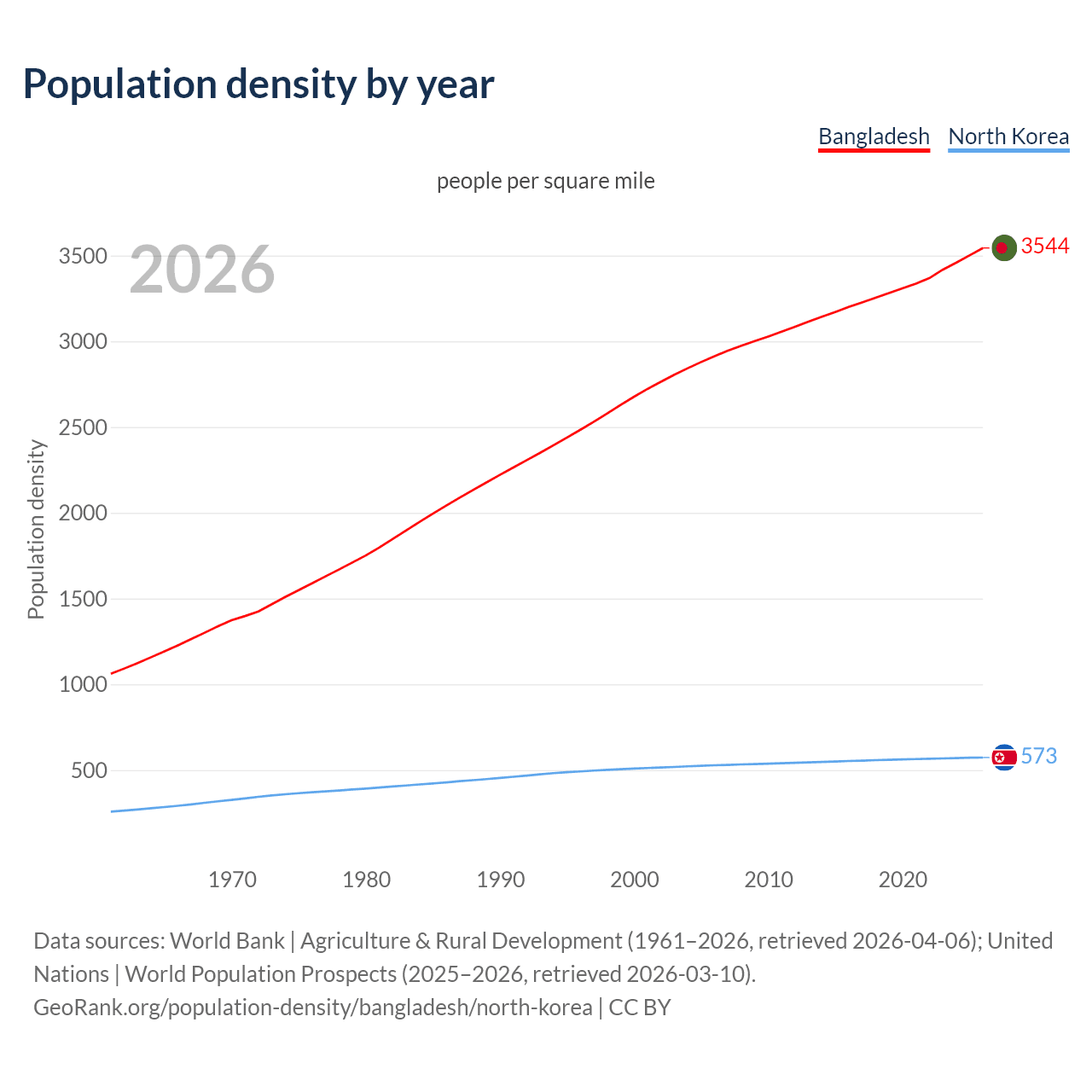 From 2006 to 2026, population density in Bangladesh increased by 21.6%, compared to a 8.64% growth in North Korea.