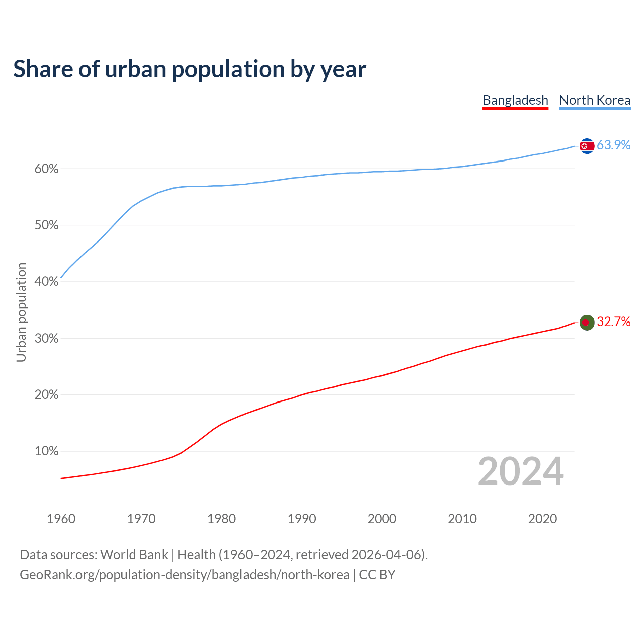From 2004 to 2024, the share of urban population changed from 25% to 32.7% in Bangladesh and from 59.7% to 63.9% in North Korea.