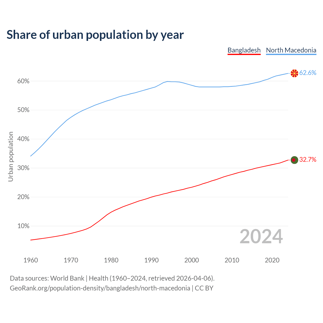 From 2004 to 2024, the share of urban population changed from 25% to 32.7% in Bangladesh and from 57.9% to 62.6% in North Macedonia.