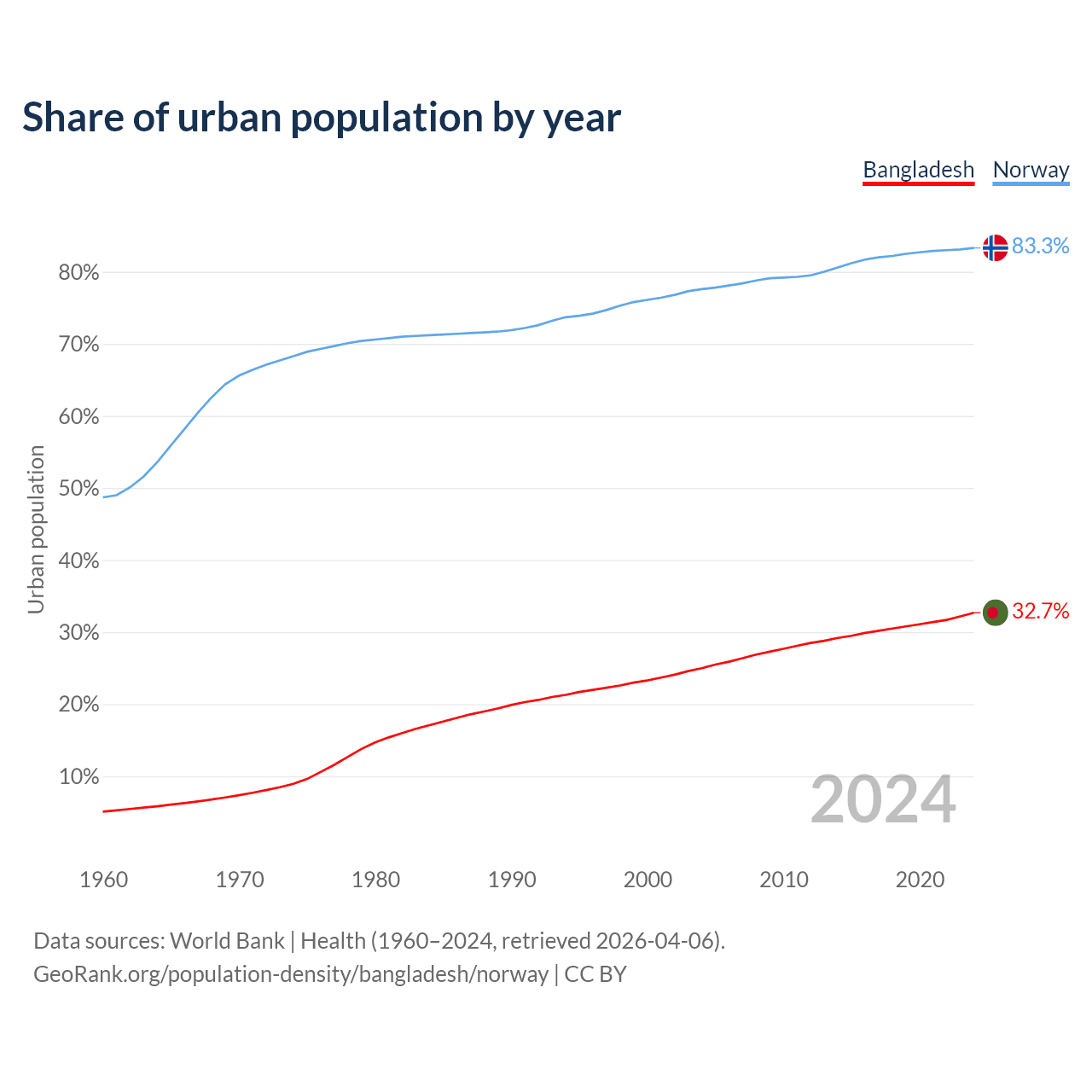 From 2004 to 2024, the share of urban population changed from 25% to 32.7% in Bangladesh and from 77.6% to 83.3% in Norway.