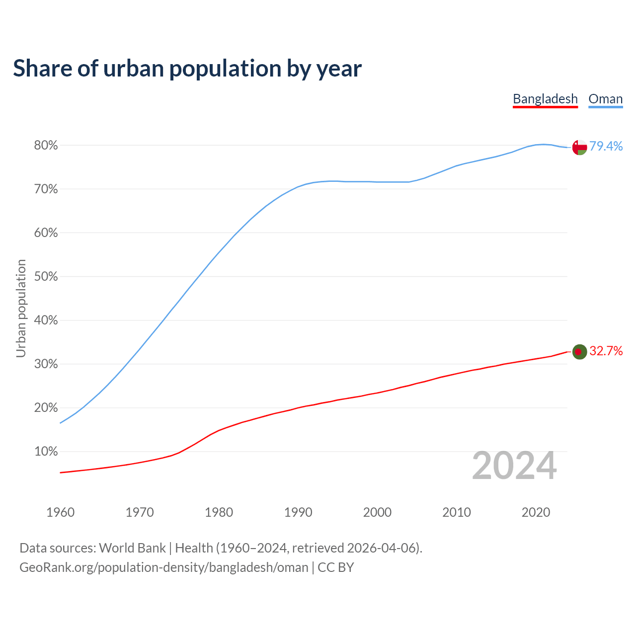 From 2004 to 2024, the share of urban population changed from 25% to 32.7% in Bangladesh and from 71.5% to 79.4% in Oman.