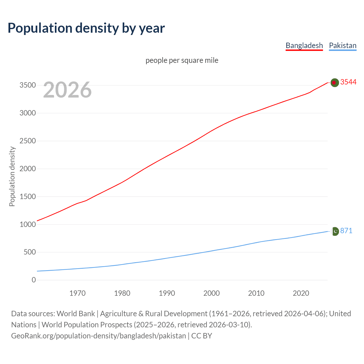 From 2006 to 2026, population density in Bangladesh increased by 21.6%, compared to a 44.3% growth in Pakistan.