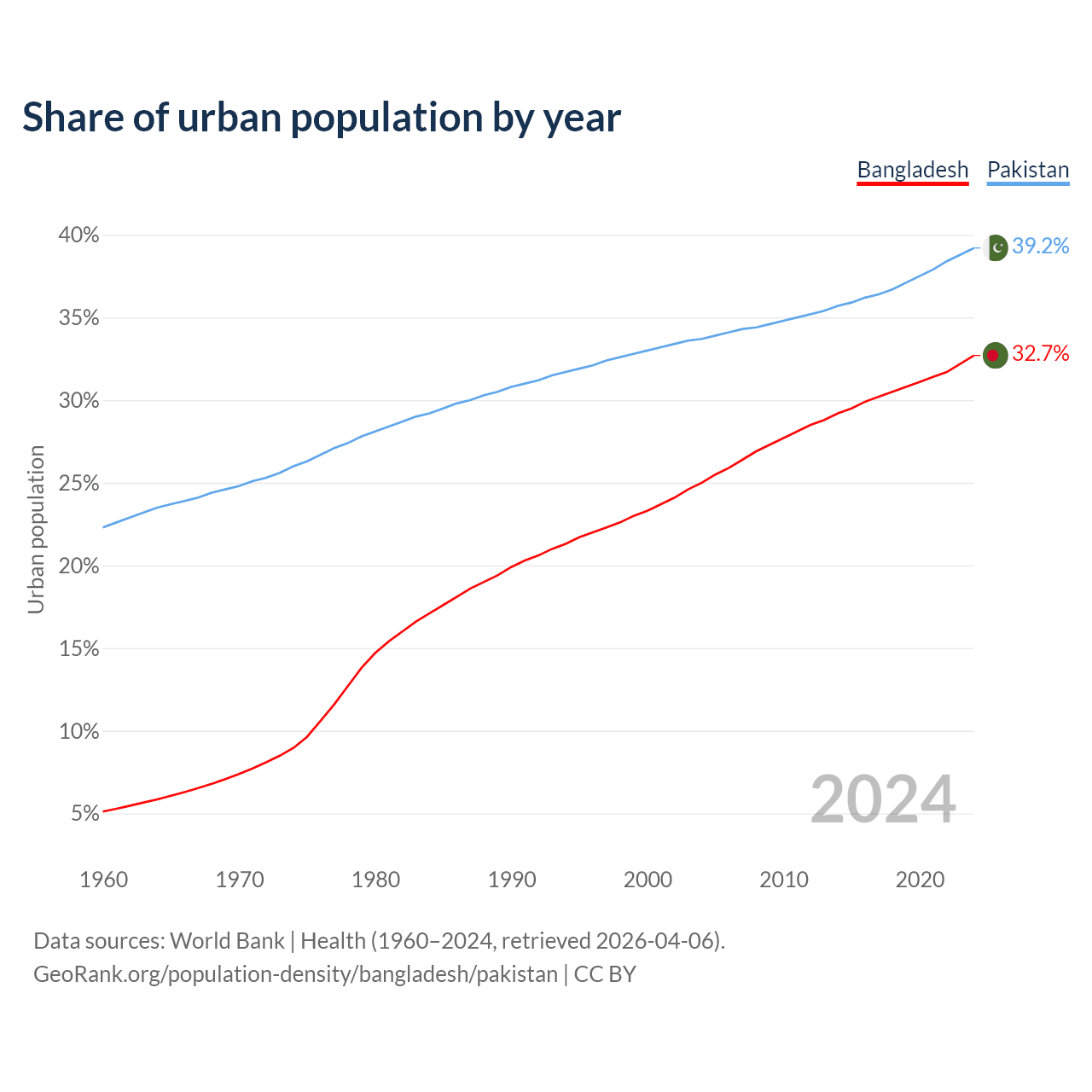 From 2004 to 2024, the share of urban population changed from 25% to 32.7% in Bangladesh and from 33.7% to 39.2% in Pakistan.