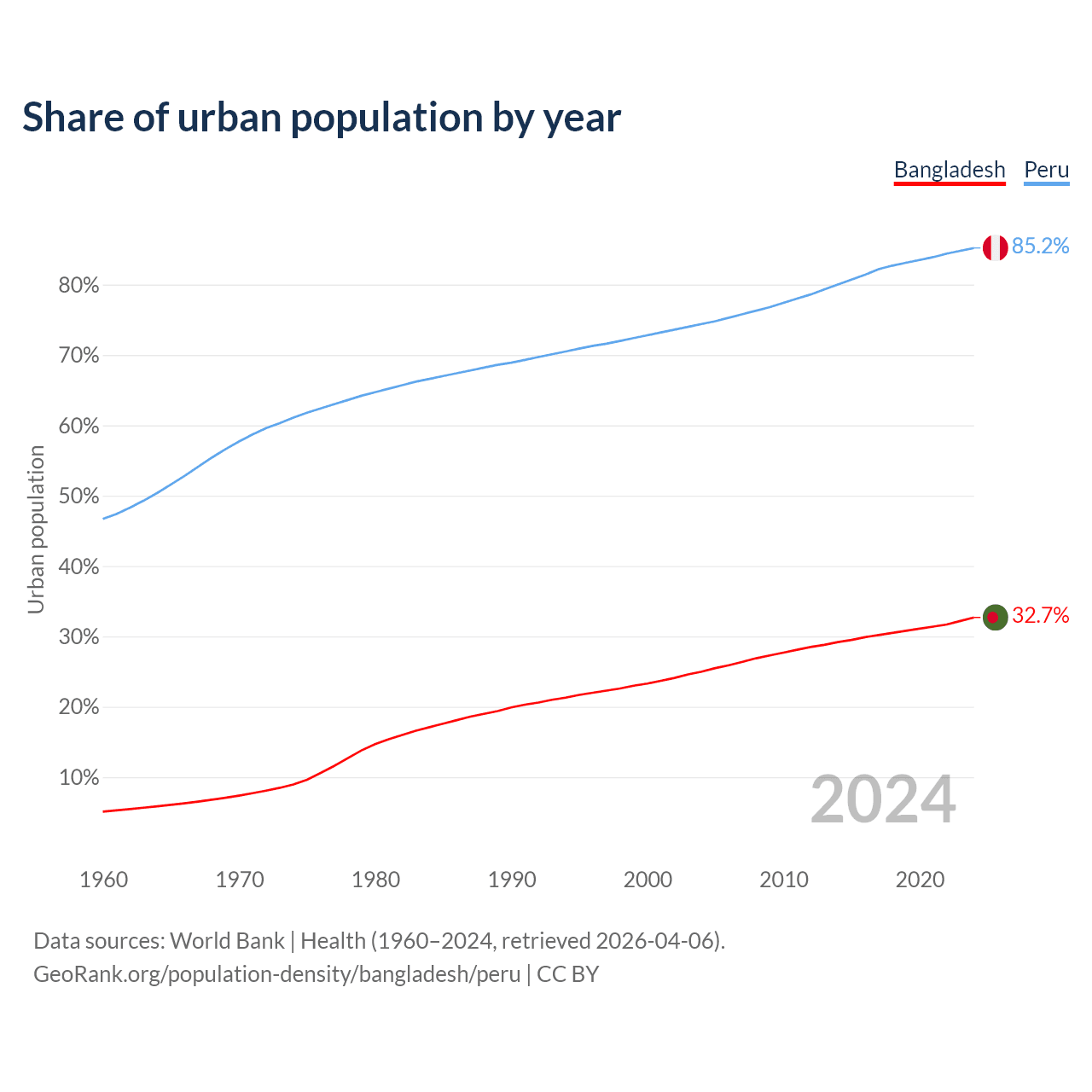 From 2004 to 2024, the share of urban population changed from 25% to 32.7% in Bangladesh and from 74.4% to 85.2% in Peru.