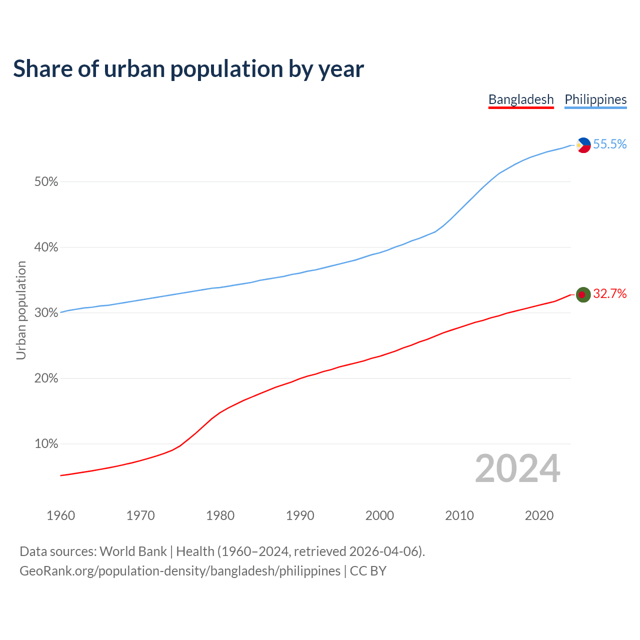 From 2004 to 2024, the share of urban population changed from 25% to 32.7% in Bangladesh and from 40.9% to 55.5% in the Philippines.