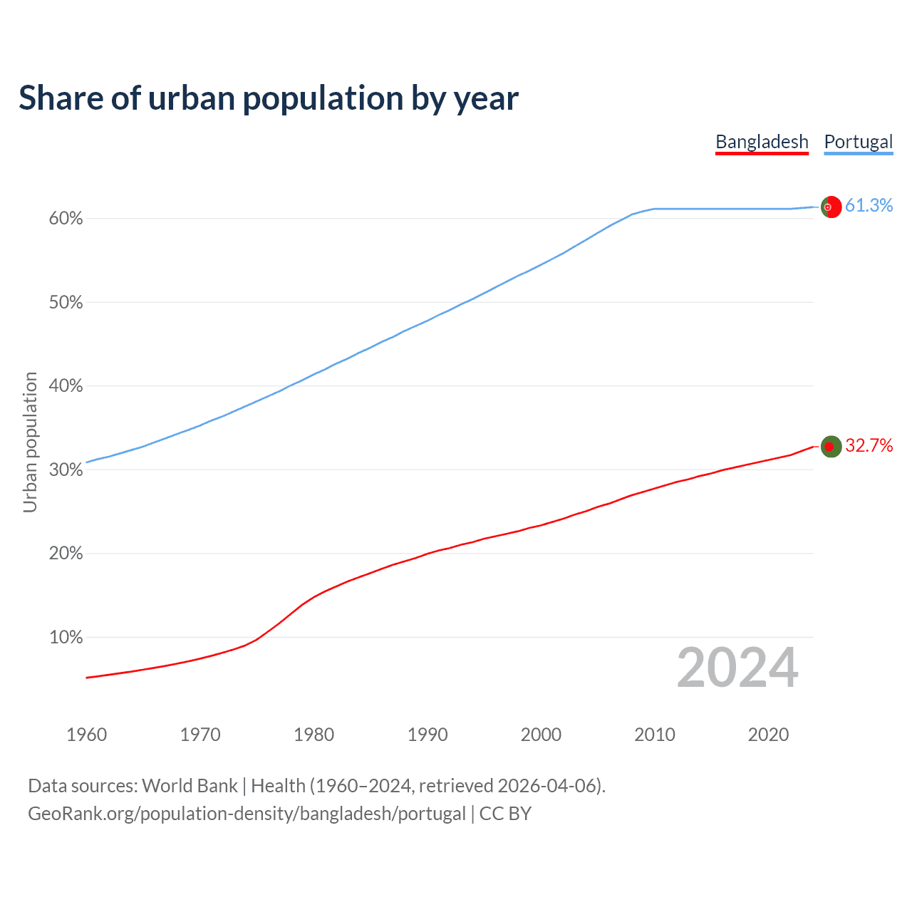 From 2004 to 2024, the share of urban population changed from 25% to 32.7% in Bangladesh and from 57.4% to 61.3% in Portugal.