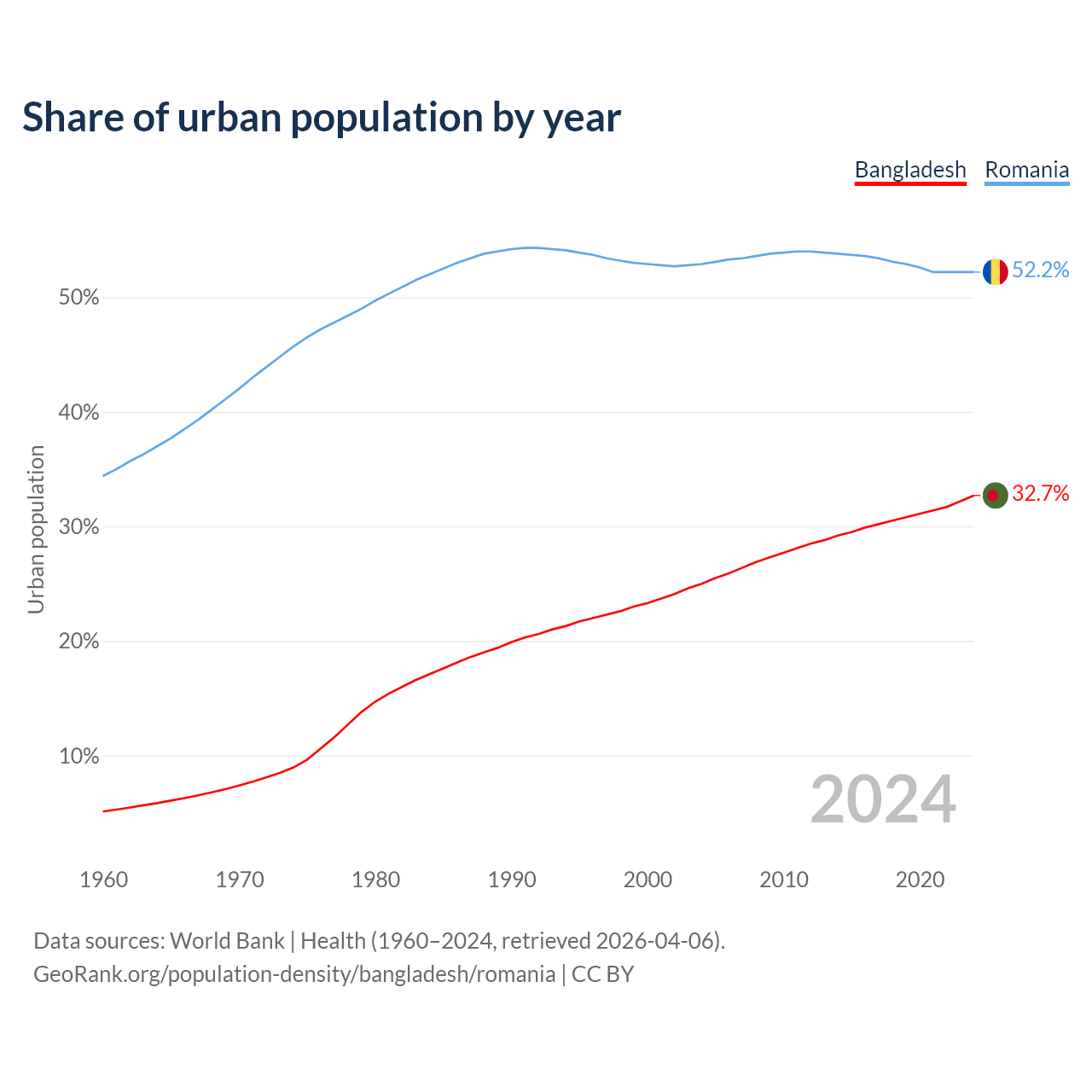 From 2004 to 2024, the share of urban population changed from 25% to 32.7% in Bangladesh and from 52.9% to 52.2% in Romania.