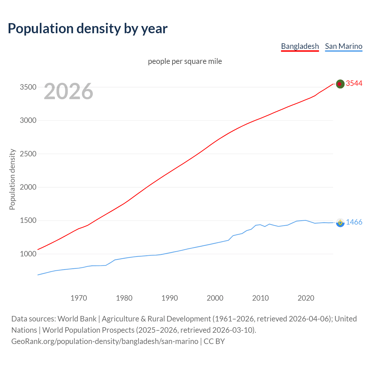 From 2006 to 2026, population density in Bangladesh increased by 21.6%, compared to a 12.5% growth in San Marino.