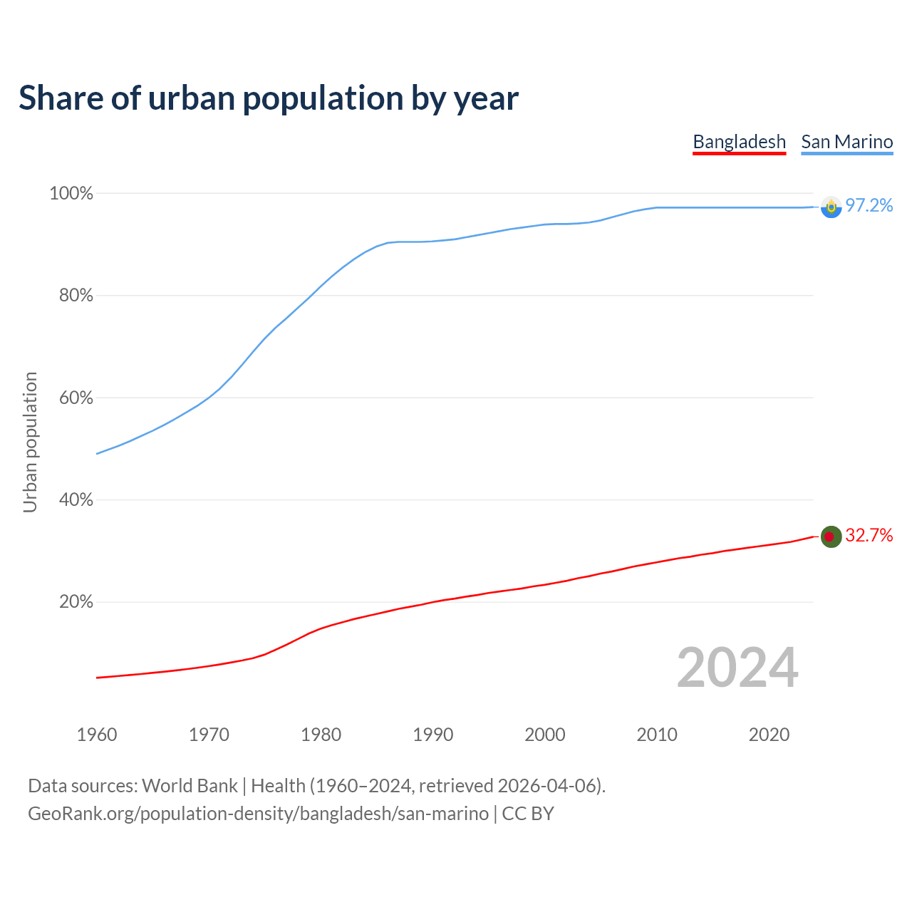 From 2004 to 2024, the share of urban population changed from 25% to 32.7% in Bangladesh and from 94.2% to 97.2% in San Marino.