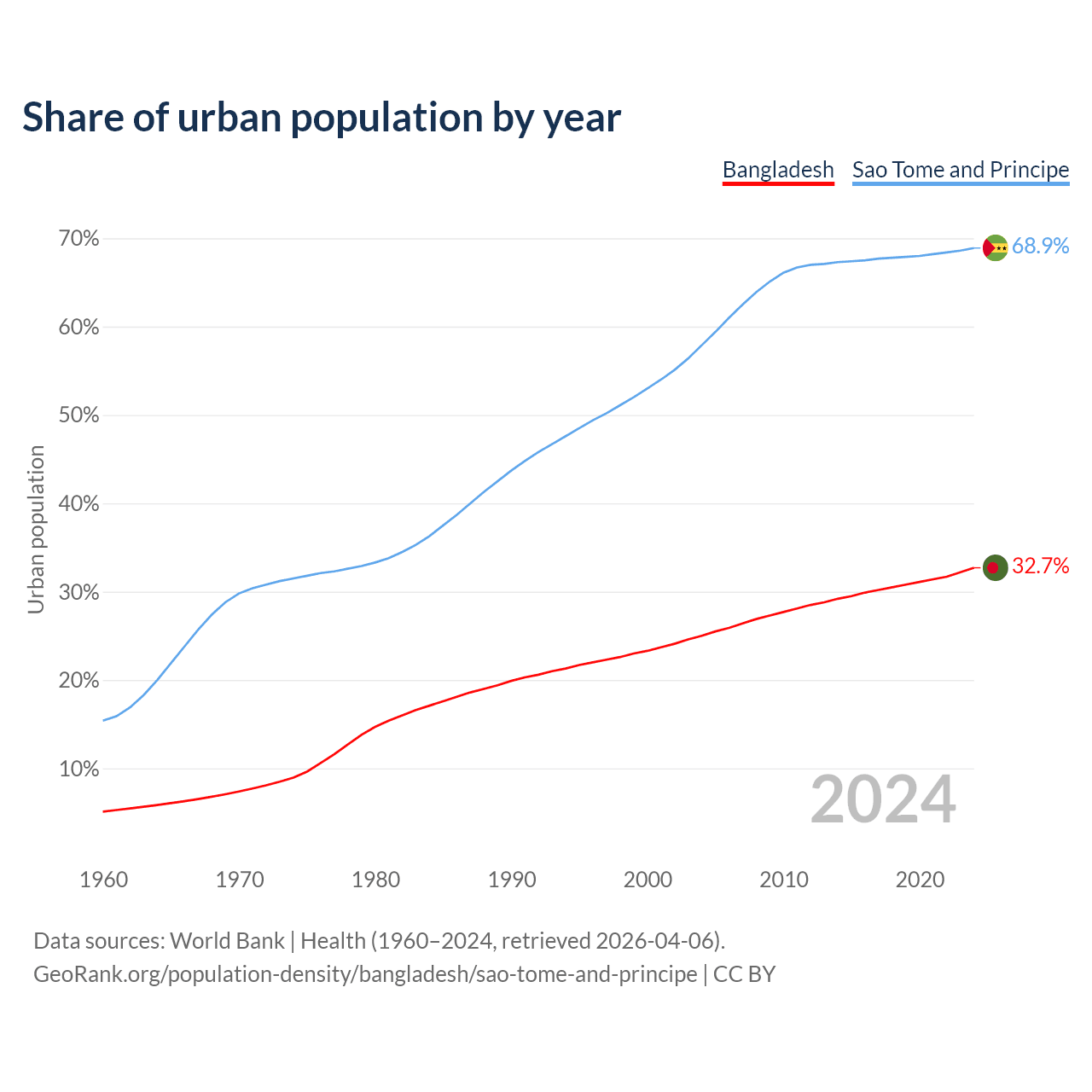 From 2004 to 2024, the share of urban population changed from 25% to 32.7% in Bangladesh and from 57.9% to 68.9% in Sao Tome and Principe.