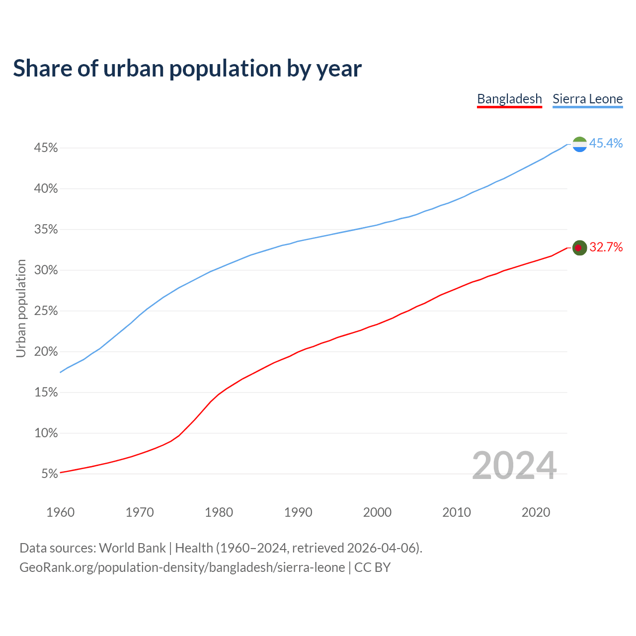 From 2004 to 2024, the share of urban population changed from 25% to 32.7% in Bangladesh and from 36.5% to 45.4% in Sierra Leone.