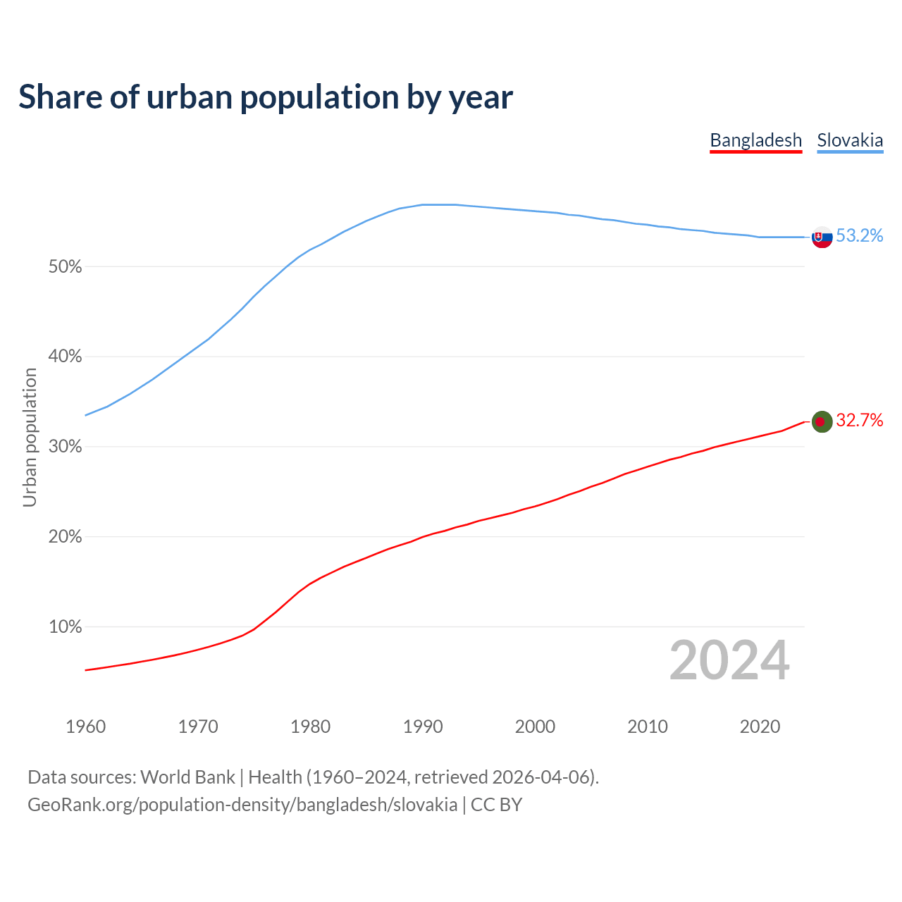 From 2004 to 2024, the share of urban population changed from 25% to 32.7% in Bangladesh and from 55.6% to 53.2% in Slovakia.