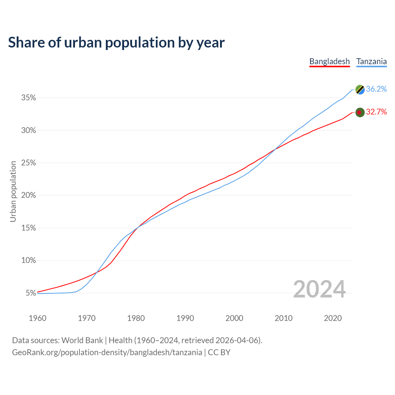 From 2004 to 2024, the share of urban population changed from 25% to 32.7% in Bangladesh and from 24.1% to 36.2% in Tanzania.